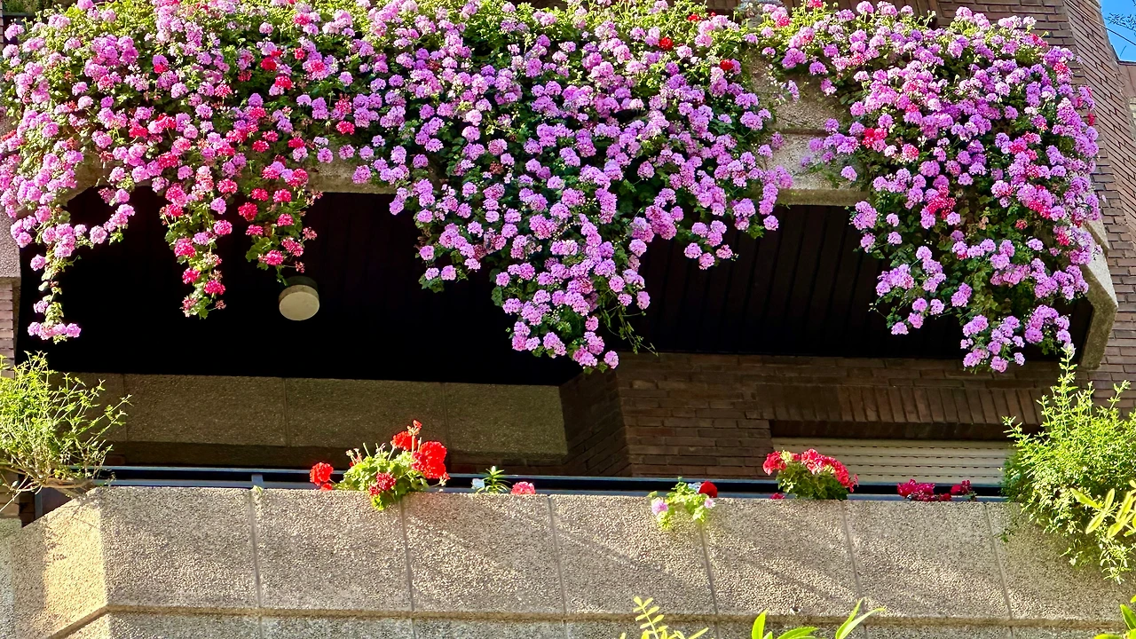 대로변 아파트 베란다에 잘 가꾼 꽃이 눈에 띈다.