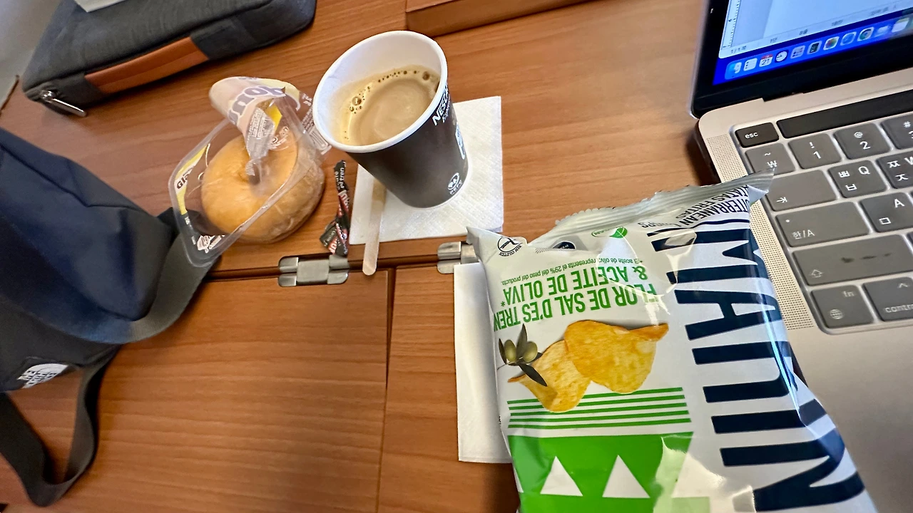 아내는 기차가 출발한 뒤 얼마 지나지 않아서 승무원이 음료와 다과를 판매하는 카터를 밀고오자 매우 반가워 하며 ‘커피+도너츠+바나나 칩'을 해치운다. 바나나 칩은 나도 같이 먹었다. 그러더니 시간이 지난 뒤 식당 칸이 있다는 것을 알고 배가 고프다고 해 식당 칸으로 가서 다시 샐러드를 먹는다. 아주 맛있게 먹었다고 말한다. 나는 아내가 여행 중에 잘 먹고 다니니 정말 다행이라는 생각을 한다. 그 반대의 경우를 생각해 보라.