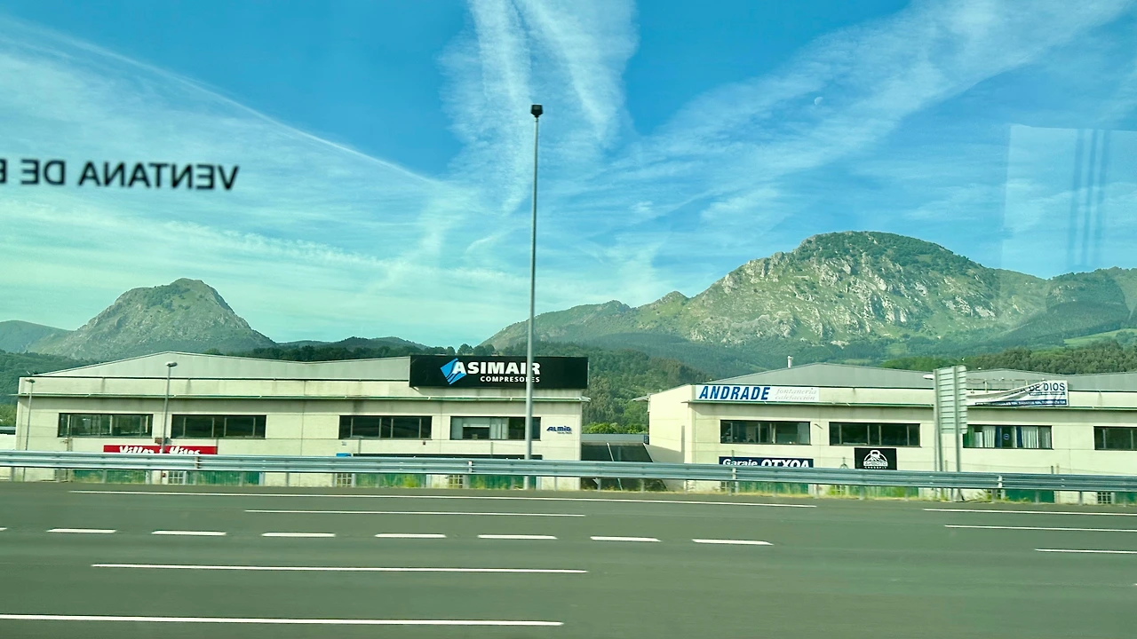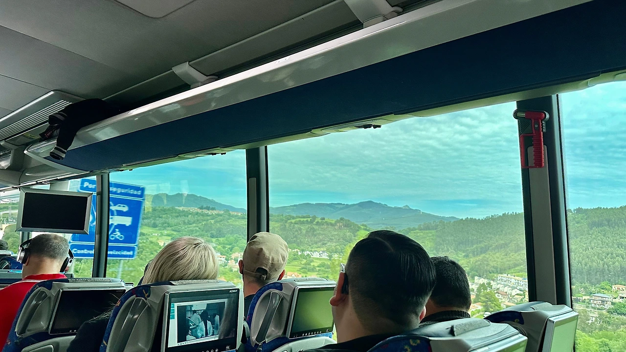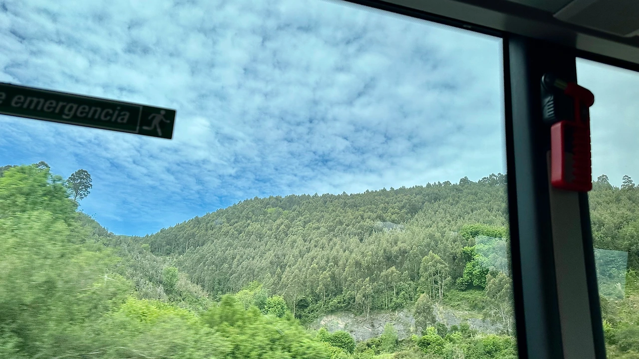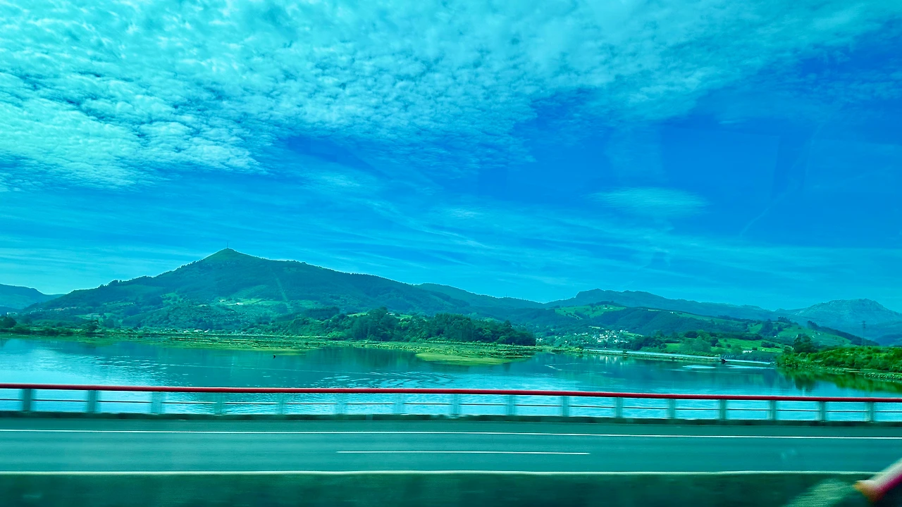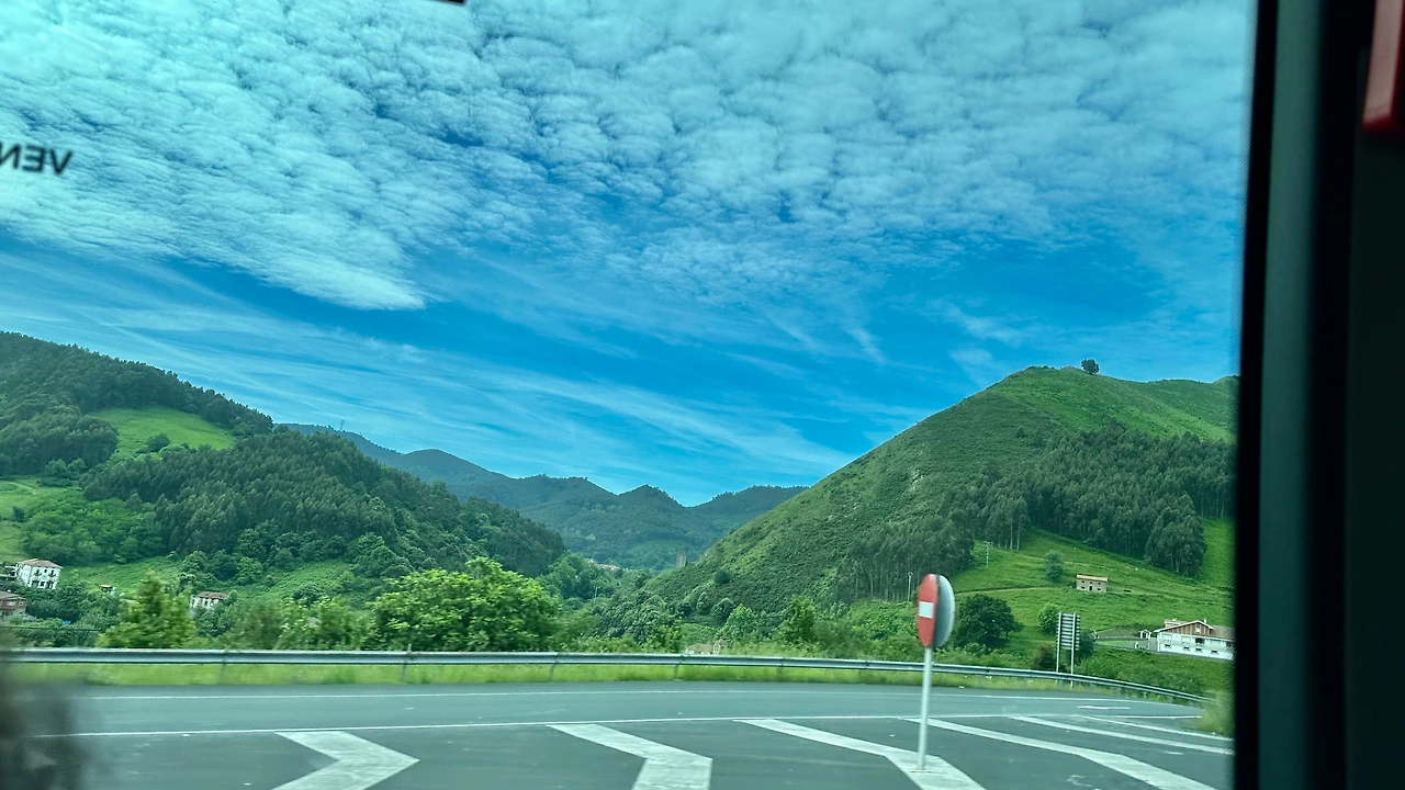 산탄데르 가는 길에 산이 많이 보인다. 북쪽 해변에서 동쪽으로부터 서쪽으로 이동하고 있다. 그래서 왼쪽으로는 높은 산이 많이 보이고 오른쪽으로는 낮은 산 그리고 구릉과 평지 또는 바다가 보인다.