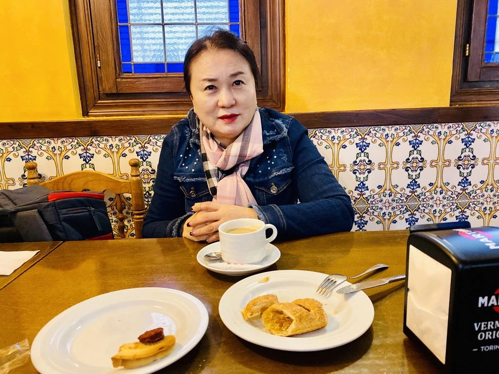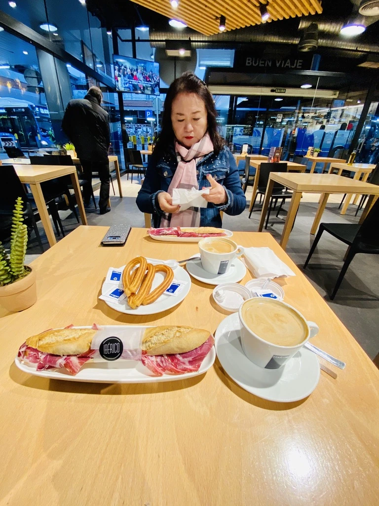 카페 문을 열고 들어가니 노인들이 낯선 동양인들을 빤히 쳐다본다. 밖에서 보기보다 좁지않고 조촐한 카페테리아이다. 실내 공기가 적당하게 훈훈하다. 따뜻한 커피에 초리조를 얹은 타파스를 곁들여 먹었다. 30여 분 쉬다가 나왔다.