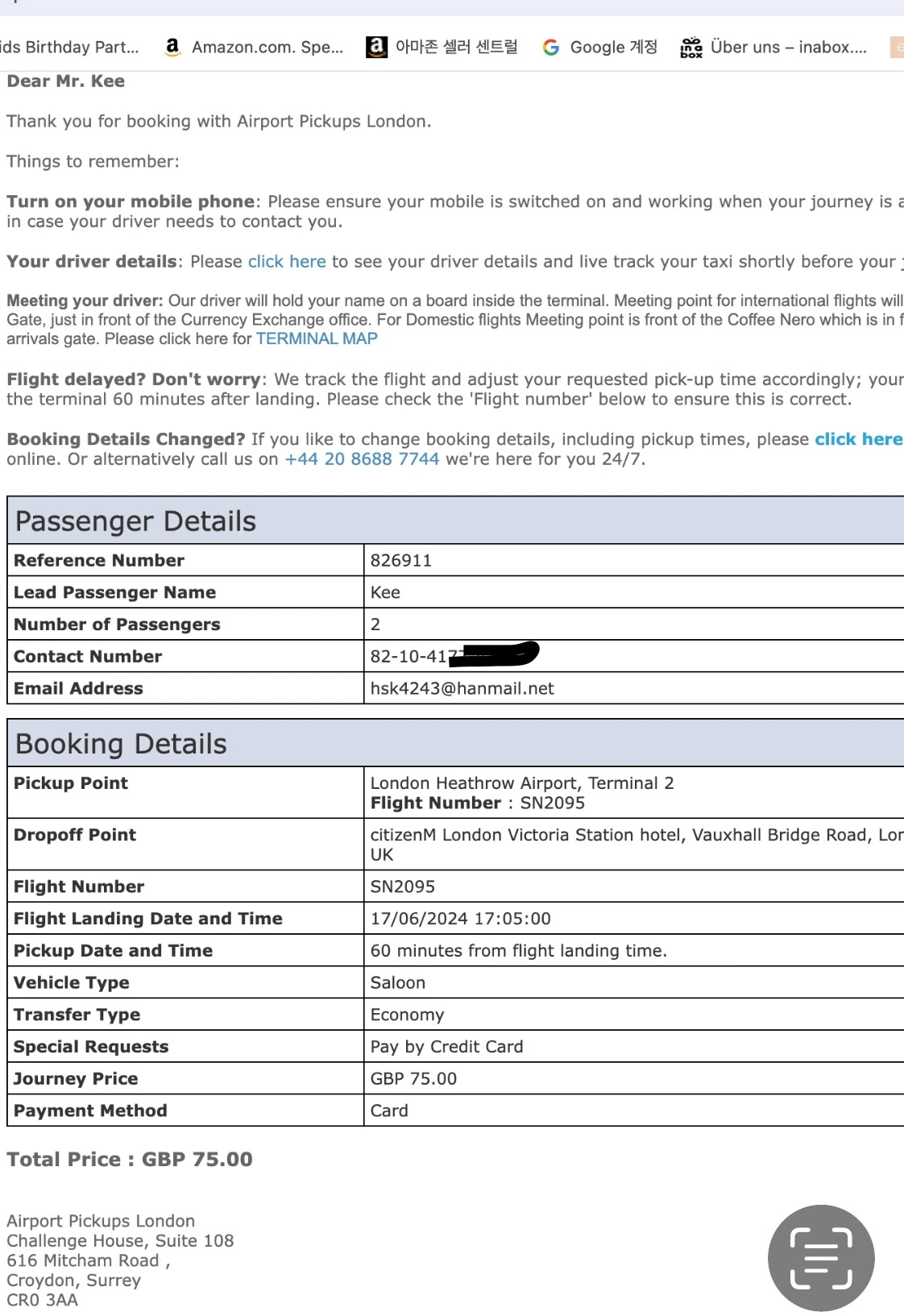 공항에서 호텔로 들어가는데 여러 가지 옵션이 있지만 짐 때문에 택시를 탈 수밖에 없다. 며느리가 영국 택시 앱을 통해 한국에서 택시 예약을 해 주었다. 물론 택시비용도 지불해 주었다. 돈 폐를 끼쳤다. 잘 타고 편하게 호텔에 도착한다.