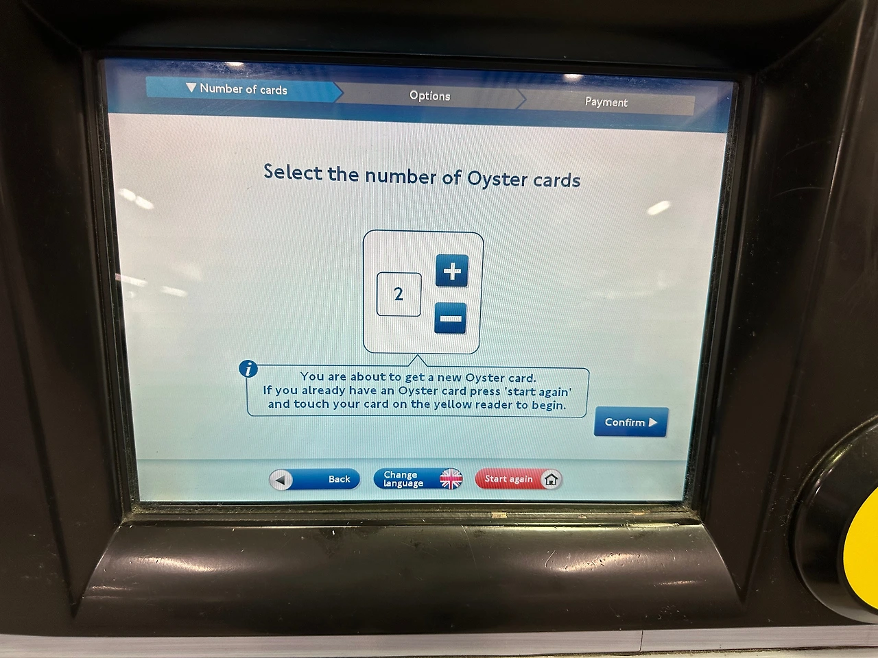 식사 후에 빅토리아 역에 가서 ‘오이스터 카드’를 구입했다. 1일 최대 부과 교통비가 9.6 파운드로 알고 있는데 나는 3일 동안 사용할 것이기 때문에 카드 구입비용 7 파운드에 20파운드를 충전한다. 두 사람이니까 54 파운드를 사용했다.