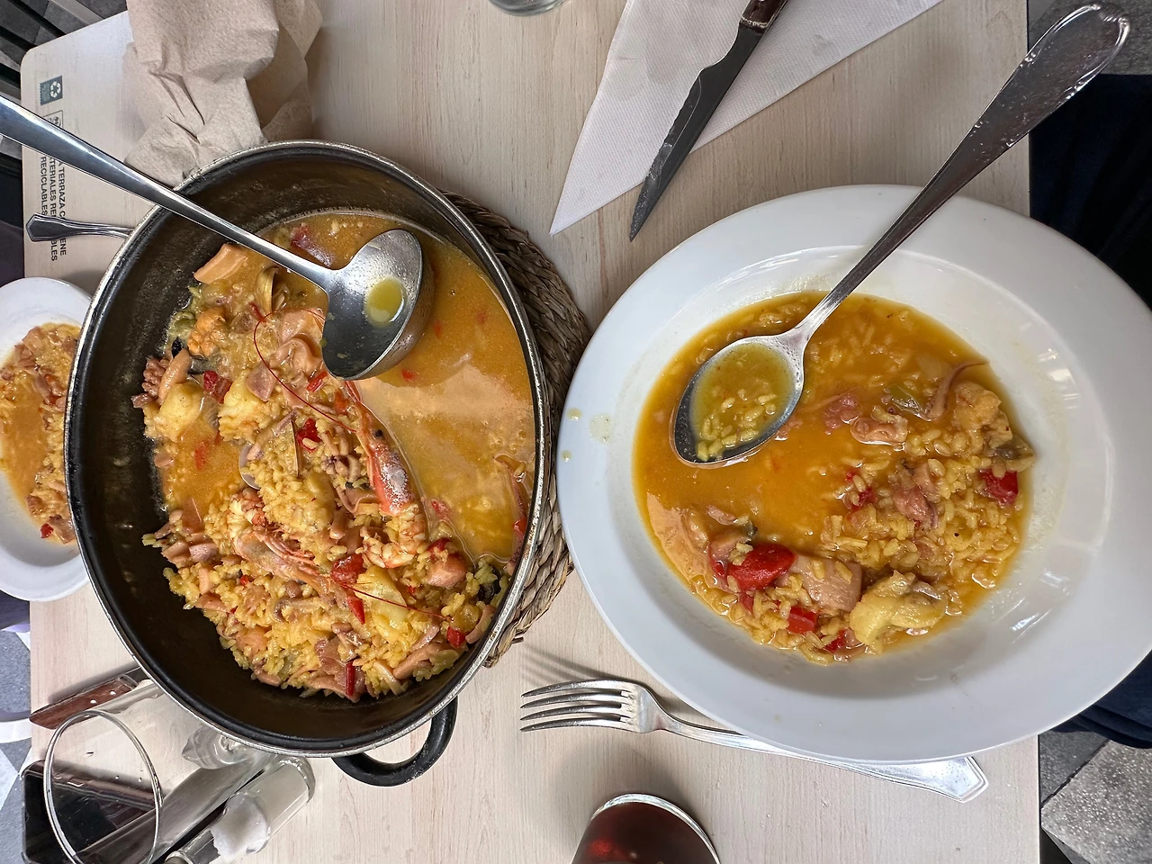 호텔에 들어온 뒤 짐만 놓아두고 점심을 먹기 위해 나온다 너무 피곤해서 멀리 나갈 생각을 하지 못하겠다. 호텔에서 가까운 카페식당에서 늦은 점심 겸 저녁을 먹는다. 국물이 많은 해산물 파에야를 주문해 먹는다. 그런대로 요기를 잘 해결하고 호텔로 돌아온다.