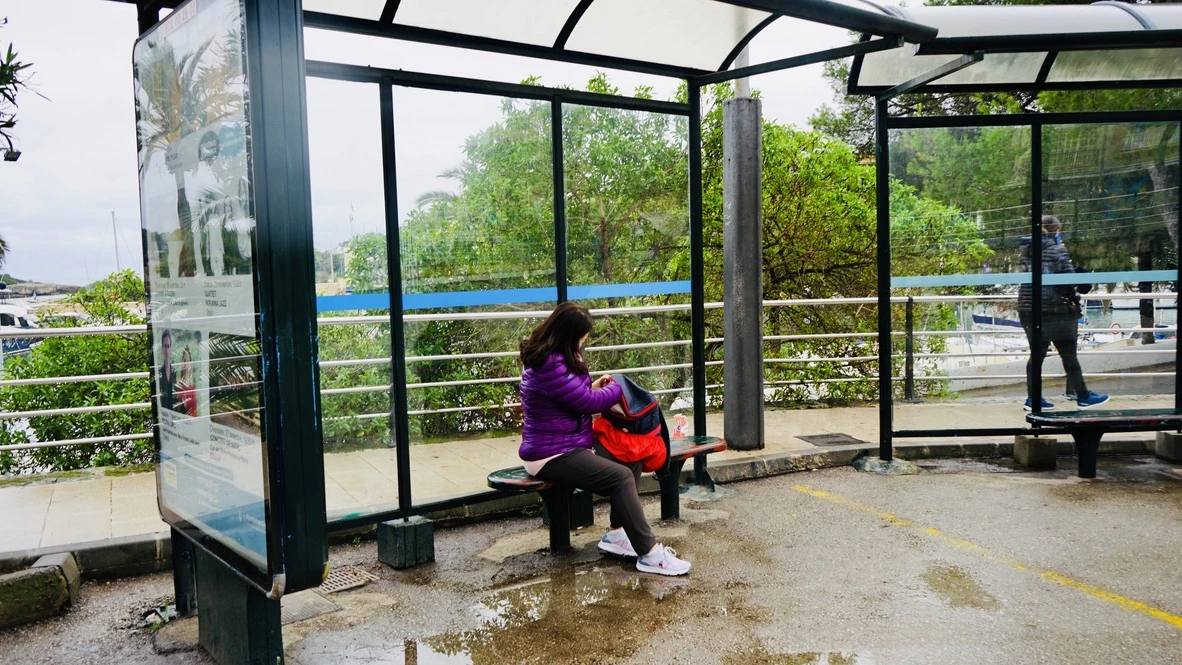 마나코르 가는 버스가 1시간당 한 대 꼴이다. 25분 남았다. 가랑비는 계속 흩날린다. 바람도 부는데 정류장에 서 있으니 으슬으슬 춥다. 피할 곳이 없다. 그냥 서 있는 수밖에. 아내는 정류장에서 백팩을 정리하고 있다. 아마 조금 전 구입한 마호리카 진주를 백팩에 잘 넣기 위해 정리하고 있을 것이다.