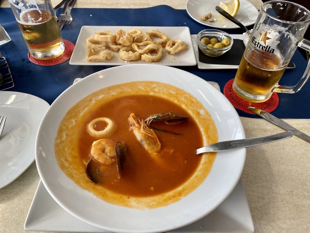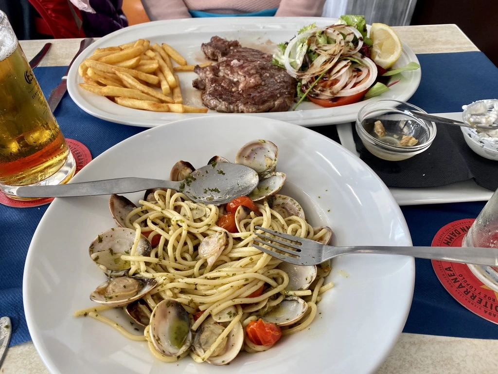 아내는 전식으로 오징어 튀김 나는 소파 데 페스카도(Sopa de Pescado) 본식은 아내는 소고기 스테이크 나는 조개 스파게티를 먹었다. 아내는 우리나라 오징어 값이 비싸서 먹기 힘들다며 오징어 튀김에 레몬을 듬뿍 뿌려 먹는다. 본인이 좋아하는 소고기 스테이크도 푸짐하다. 무척 만족하고 행복하게 먹는다. 맥주도 한잔 비우고 자기가 한 잔 더 시켜 나에게 반 따라주고 나머지는 자기가 마신다.
