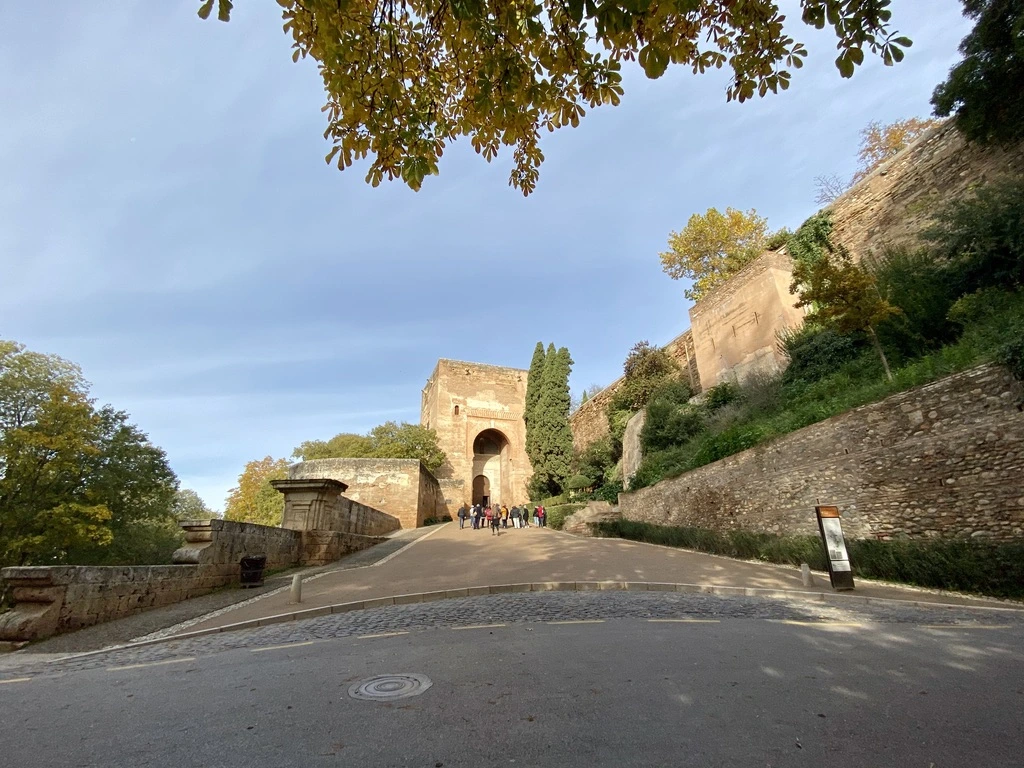 아침 식사 후 알람브라 궁전 가는 길 탐색에 나섰다. 법원 건물 옆 좁은 골목이 올라가는 입구이다. 알람브라 궁전 가는 길 표시가 되어있다. 골목길은 가파르지만 걸을만 하다. 올라가다 보니 성문이 있다. 그라나다의 문이라고 지도에 표기되어 있다.