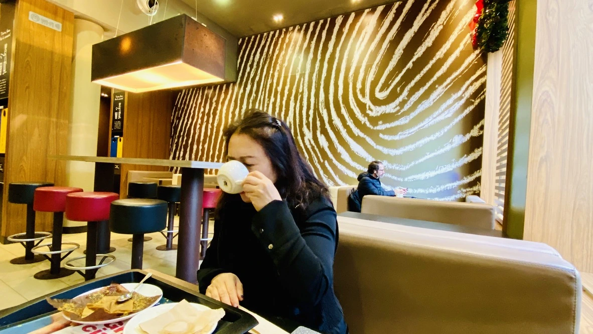 한국인 관광객이 매장 자판기를 통해 아침 식사를 주문하는 것이 보인다. 맥도널드에서 한국인을 보는 것은 처음이다.