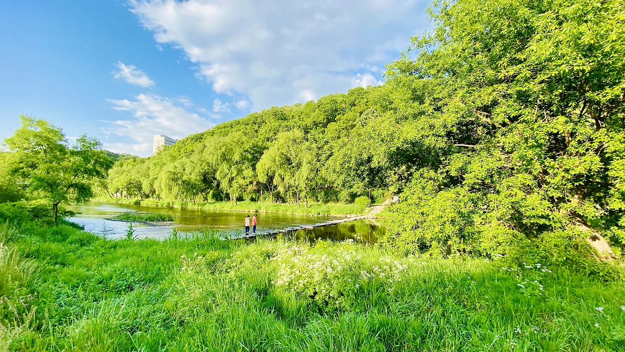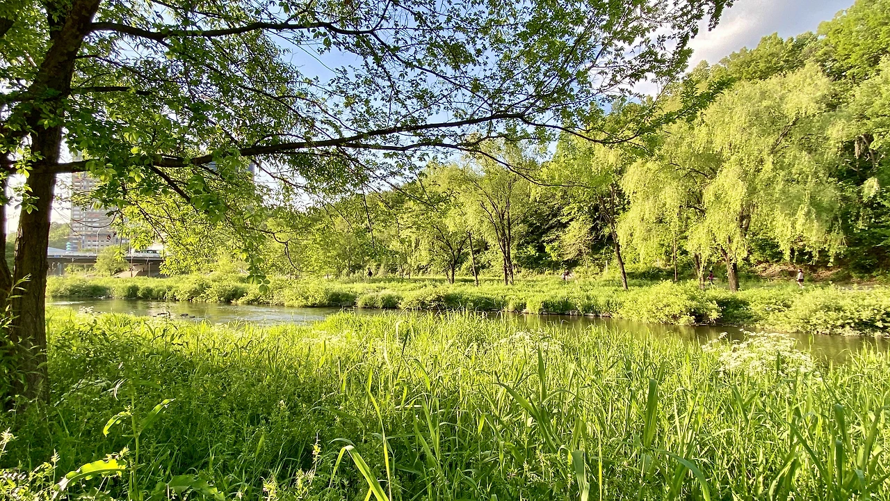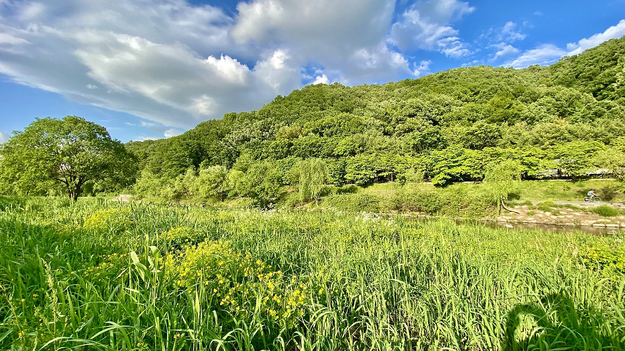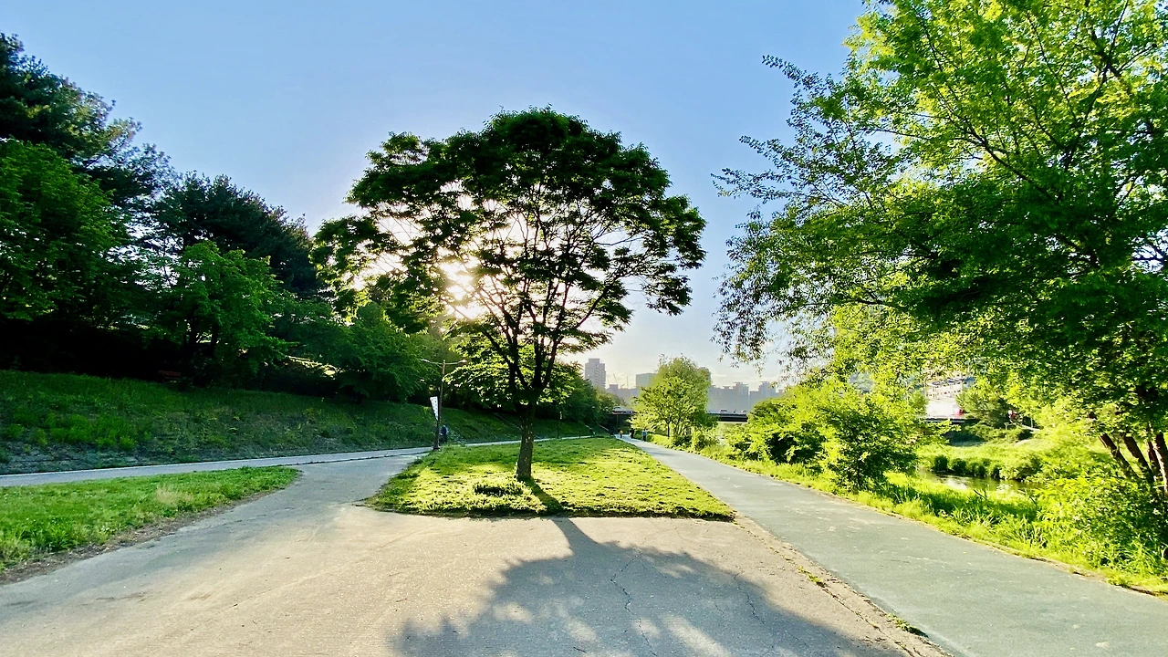 또한 미세먼지가 없어 좋다. 어제까지 한 이틀 온 비 때문일 것이다. 물도 깨끗하고 풀밭이 푸르며 산이 풍성해졌다. 황토색 석양이 비치며 탄천 풍경은 밝음과 음영이 어우러진다. 전체적으로 잔잔하다.