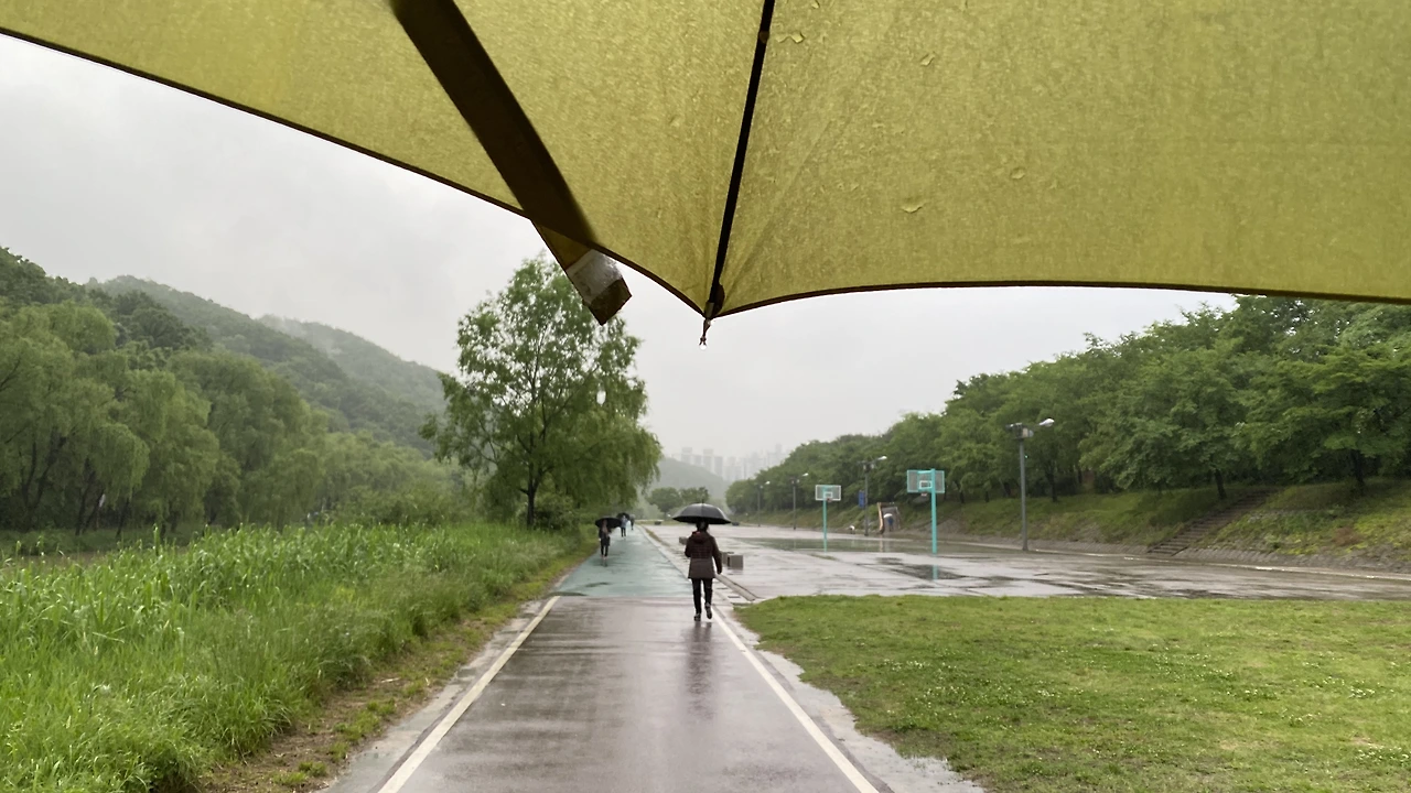 하여튼 우중에 그것도 가랑비가 아닌 소나기 맞으며 산책해 본 것은 처음이다. 그러나 생각보다 기분이 시원했다. 특히 반바지를 입고 있어 종아리를 때리는 빗방울이 시원했다. 기왕에 다 젖어버린 신발을 신고 산책로 물 웅덩이를 피하지 않으면서 저벅저벅 걸어가는 것도 괜찮았다.