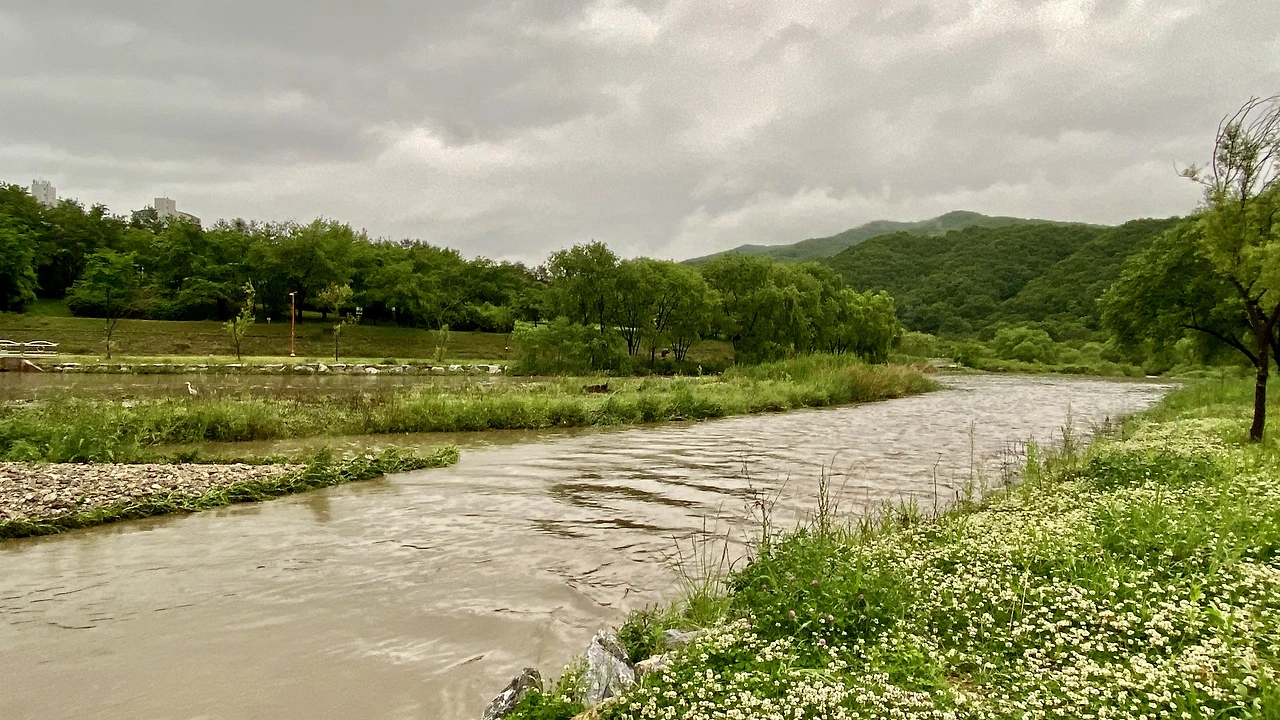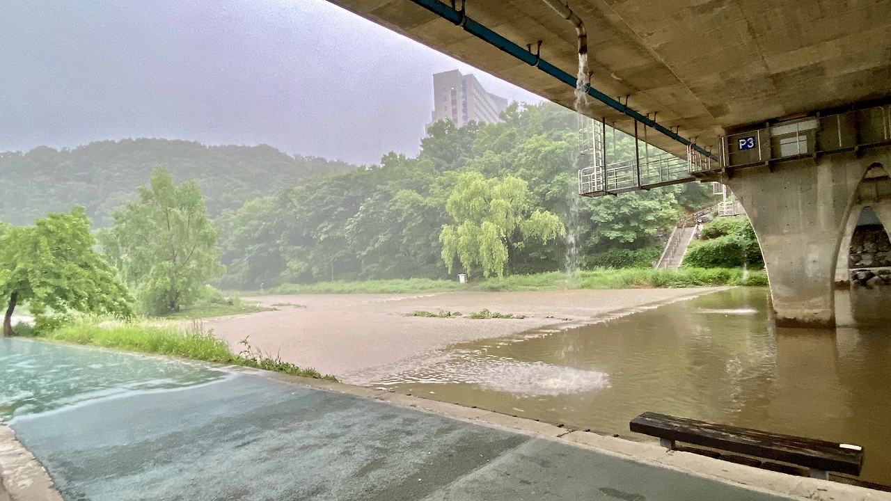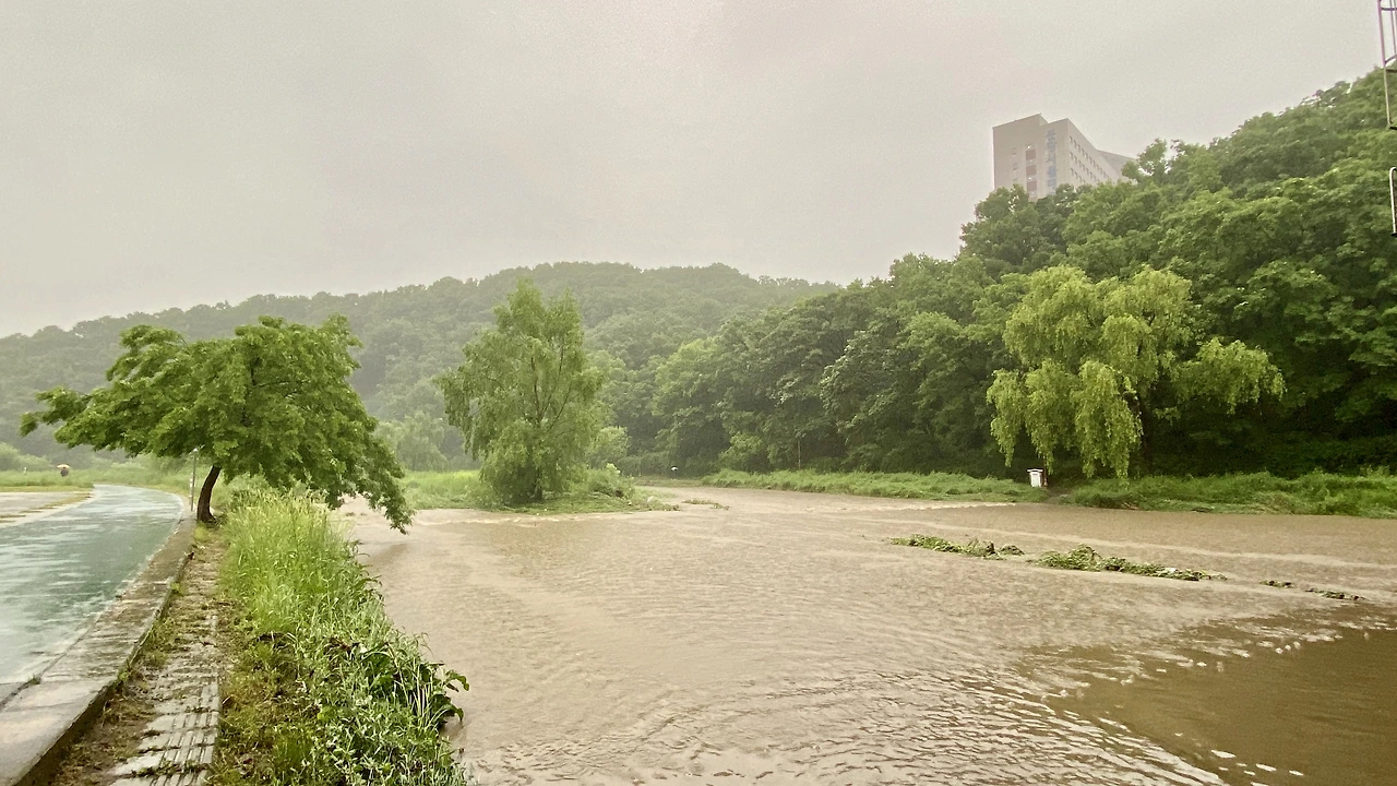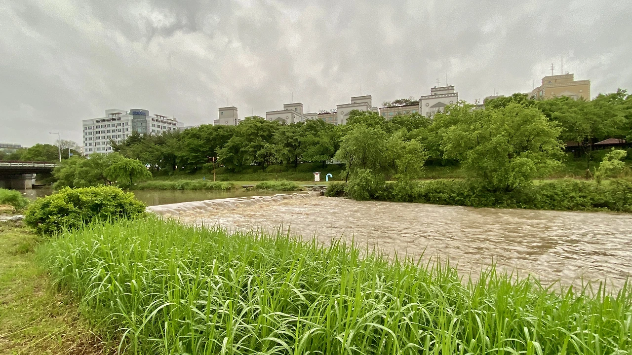 탄천 물이 아직은 넘치지 않고 잘 흐르고 있다. 그런데 소나기가 더 계속되면 아마 산책로까지 올라올 것이다. 그렇게 될까? 내일 보면 알겠지. 그러면 탄천 산책로가 며칠 동안 산만해진다. 물에 쓸려온 퇴적물로...