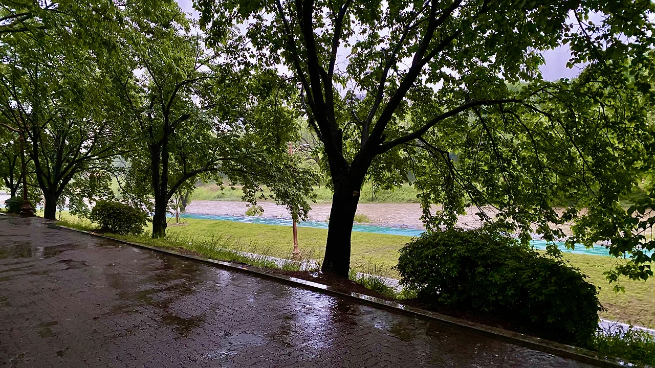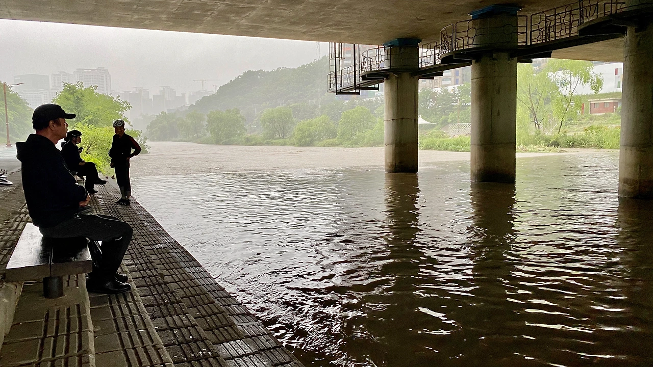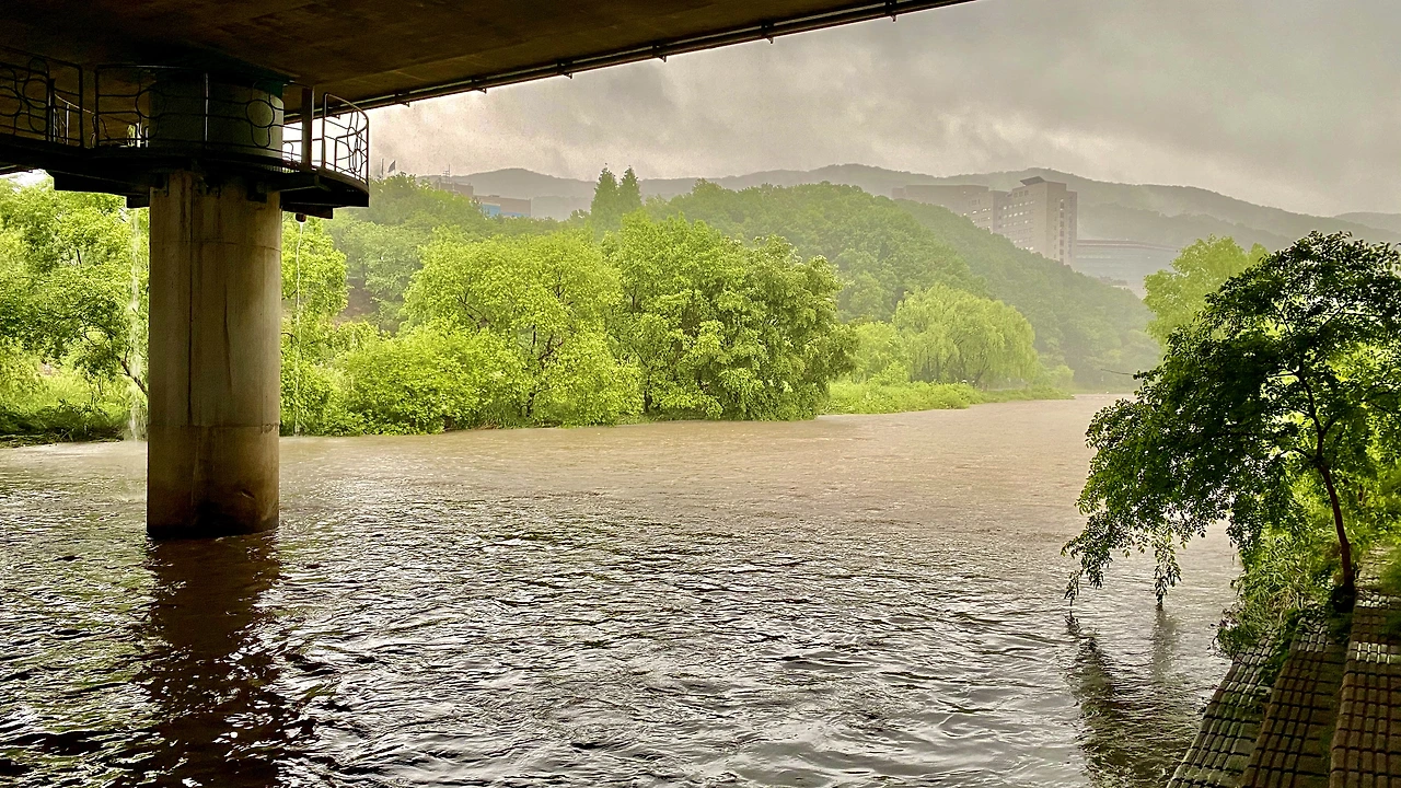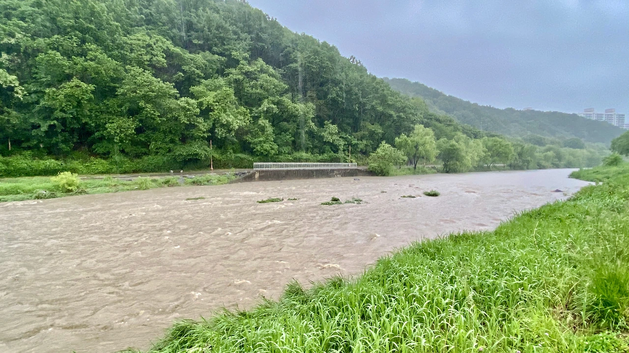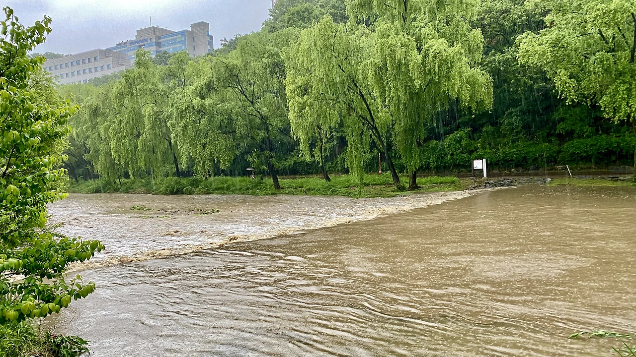 탄천 물이 아직은 넘치지 않고 잘 흐르고 있다. 그런데 소나기가 더 계속되면 아마 산책로까지 올라올 것이다. 그렇게 될까? 내일 보면 알겠지. 그러면 탄천 산책로가 며칠 동안 산만해진다. 물에 쓸려온 퇴적물로...