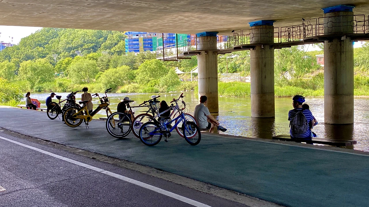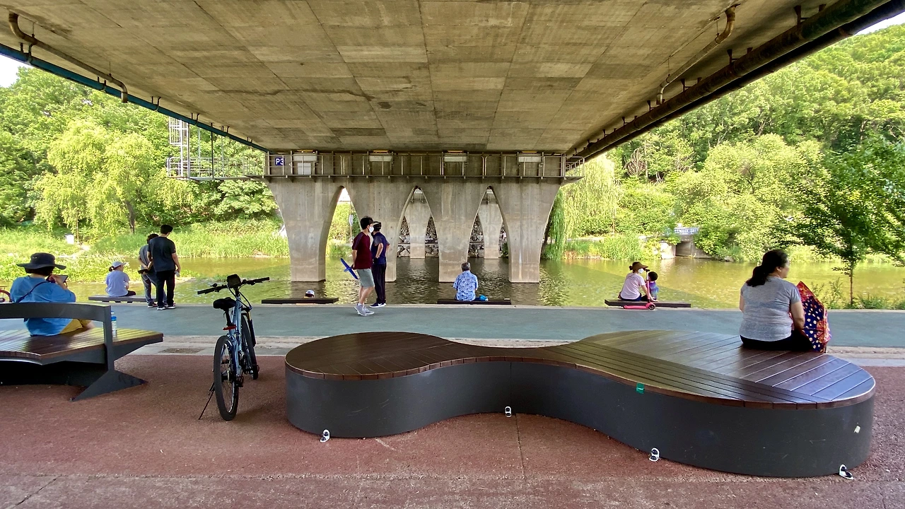 탄천 다리 밑은 시원하다. 사람들이 다리 밑에서 쉬고 있다. 그런데 다리 밑은 왜 항상 시원한 바람이 부는 것일까? 벤치에 앉아 있으면 시원해서 일어나 걷기가 싫어진다. 그래도 다리가 굳어지면 안 되니까 5분 정도 쉬고 다시 일어나지만....