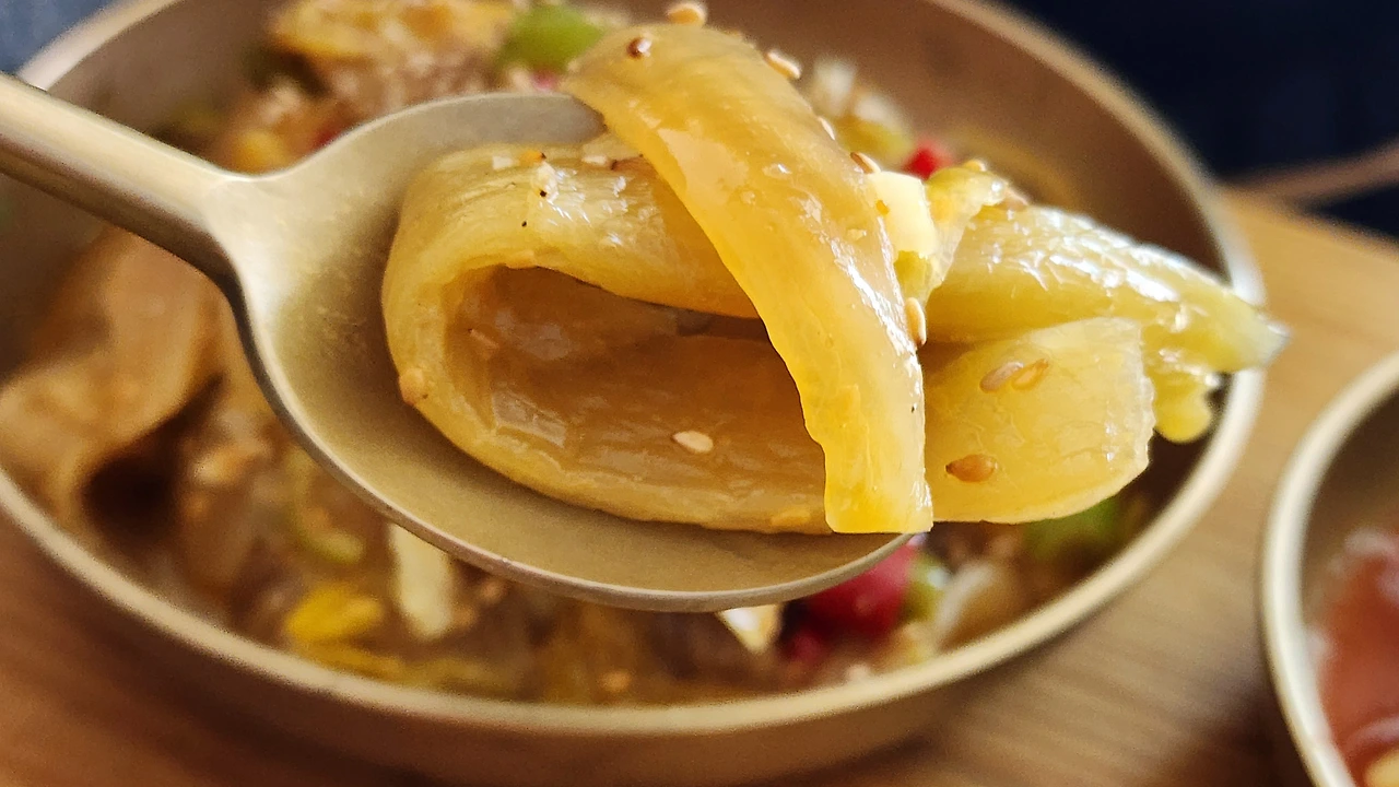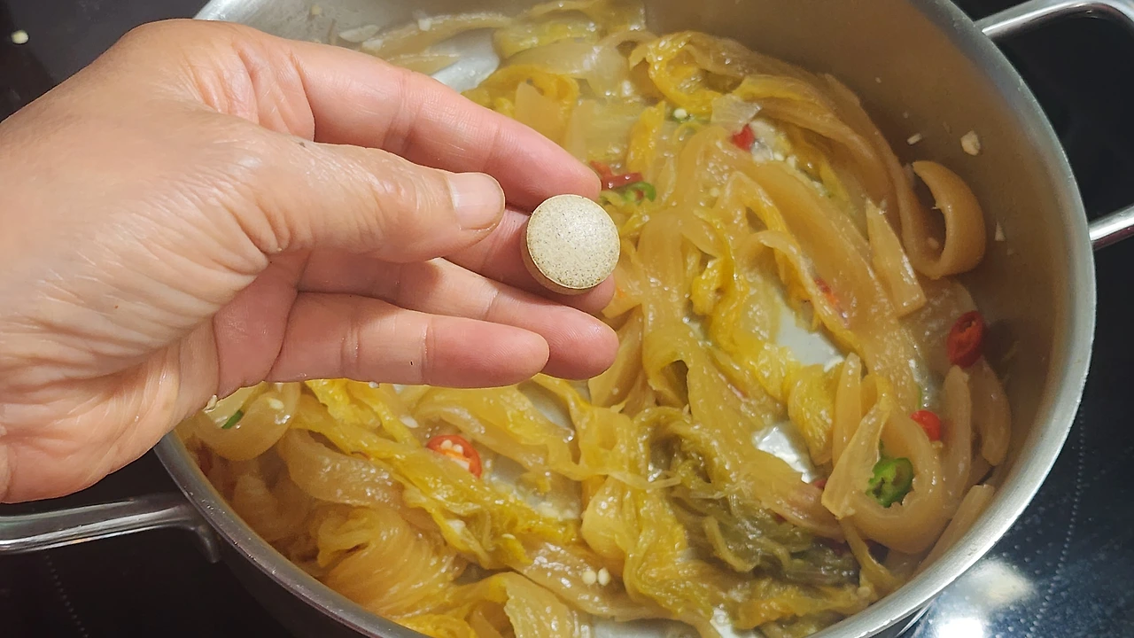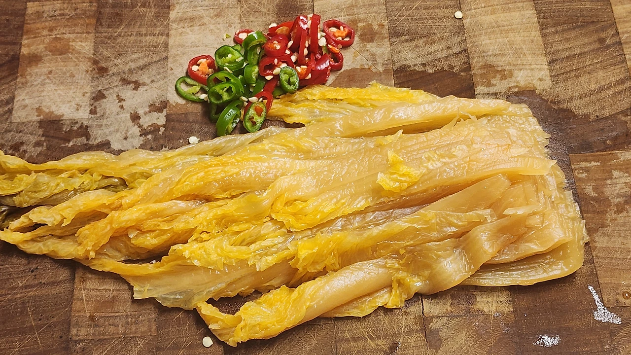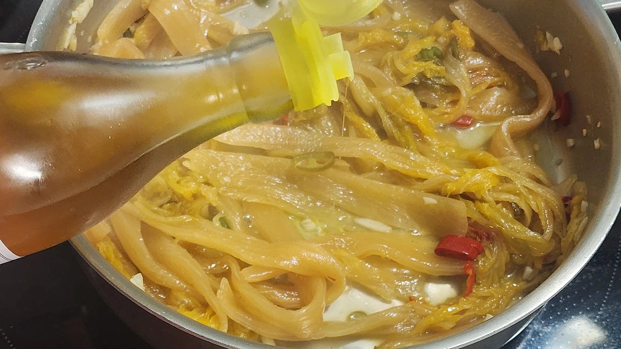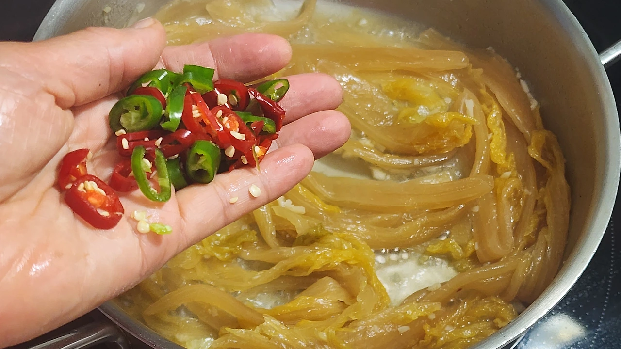 ○ 재료:묵은지 1/4 포기, 청양초 1개, 홍초 1개, 들기름 2숟가락, 동전육수 1개, 물 1컵, 식용유, 마늘, 깨소금 약간