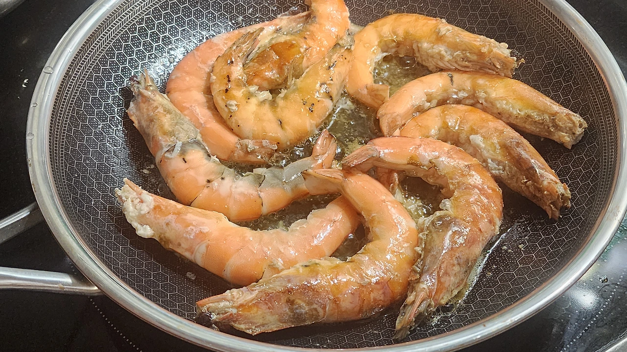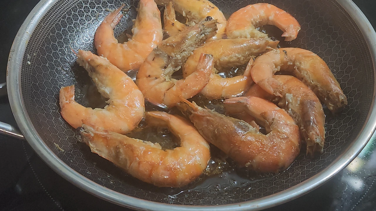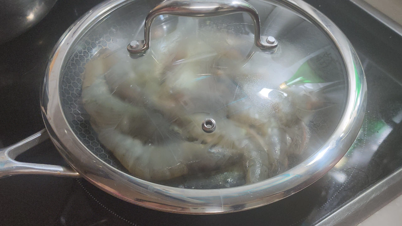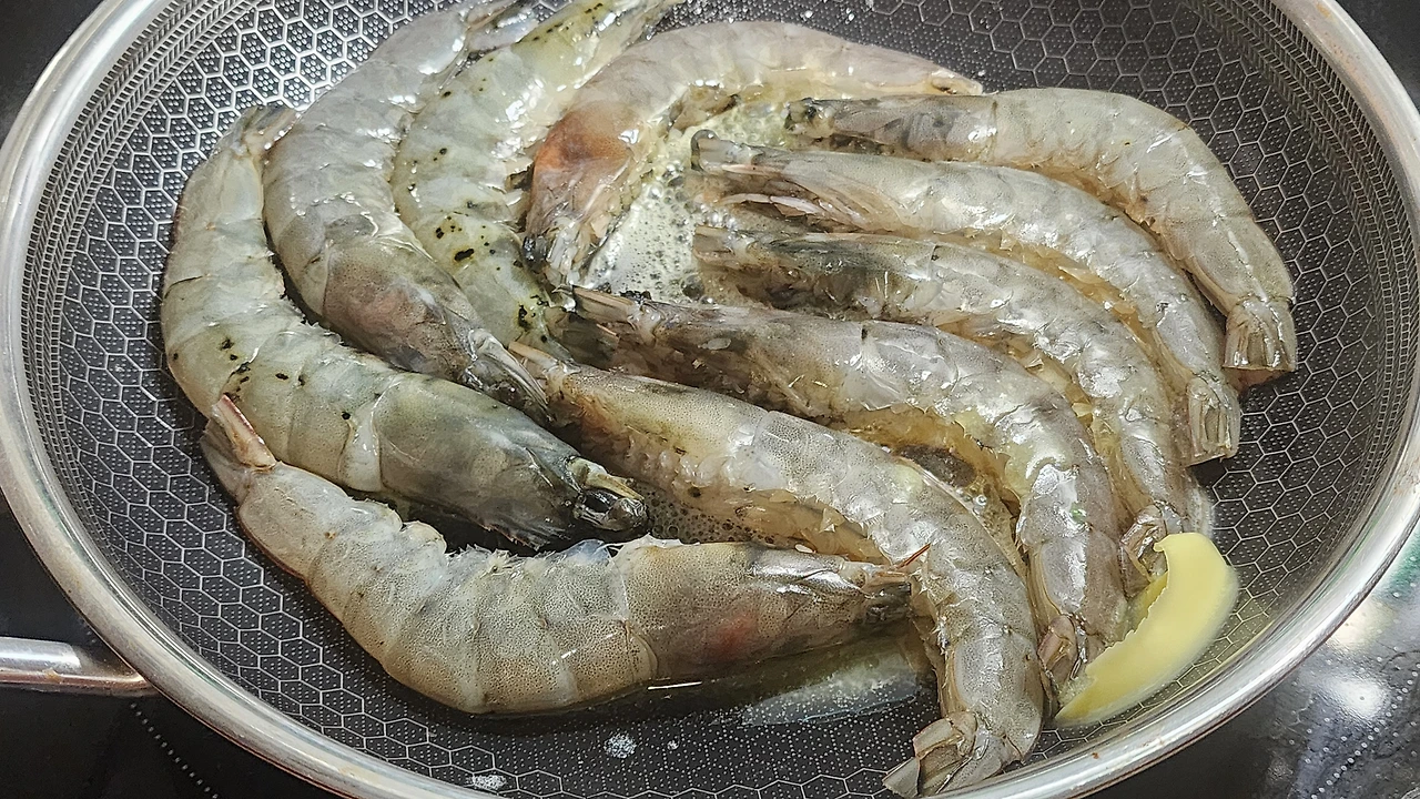- 손질한 새우를 올려 앞뒤 노릇하게 구워준다