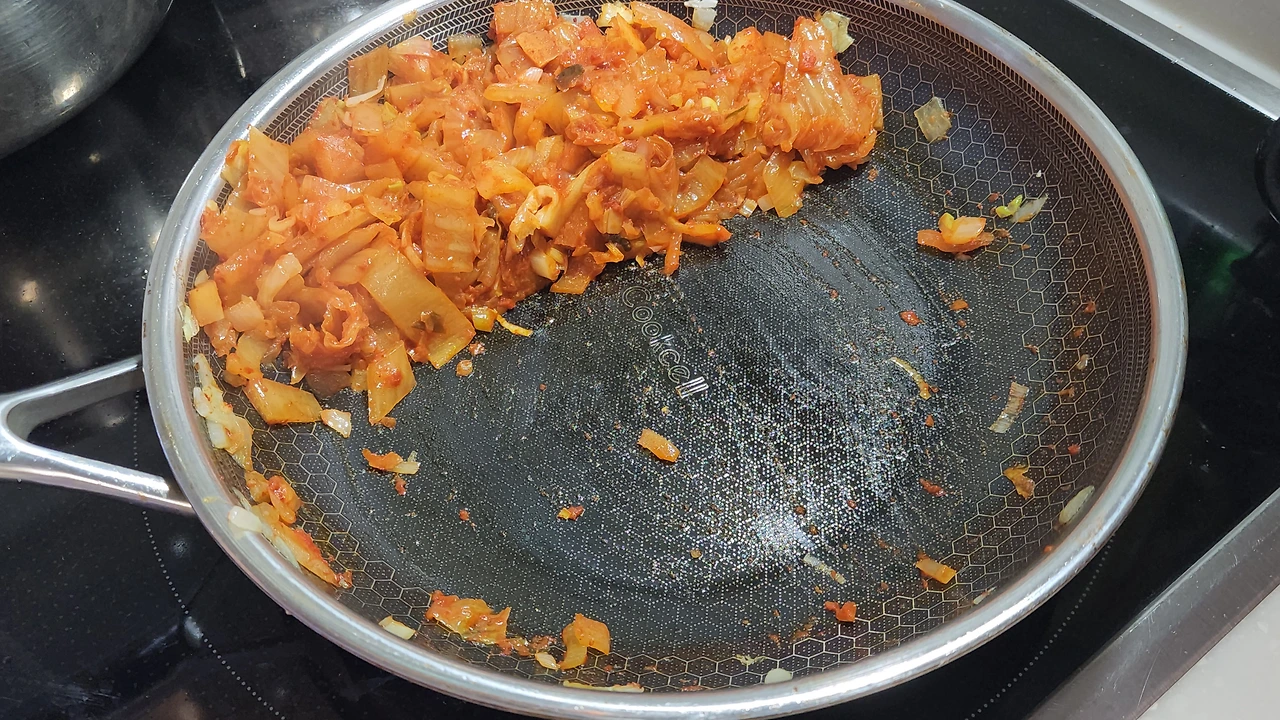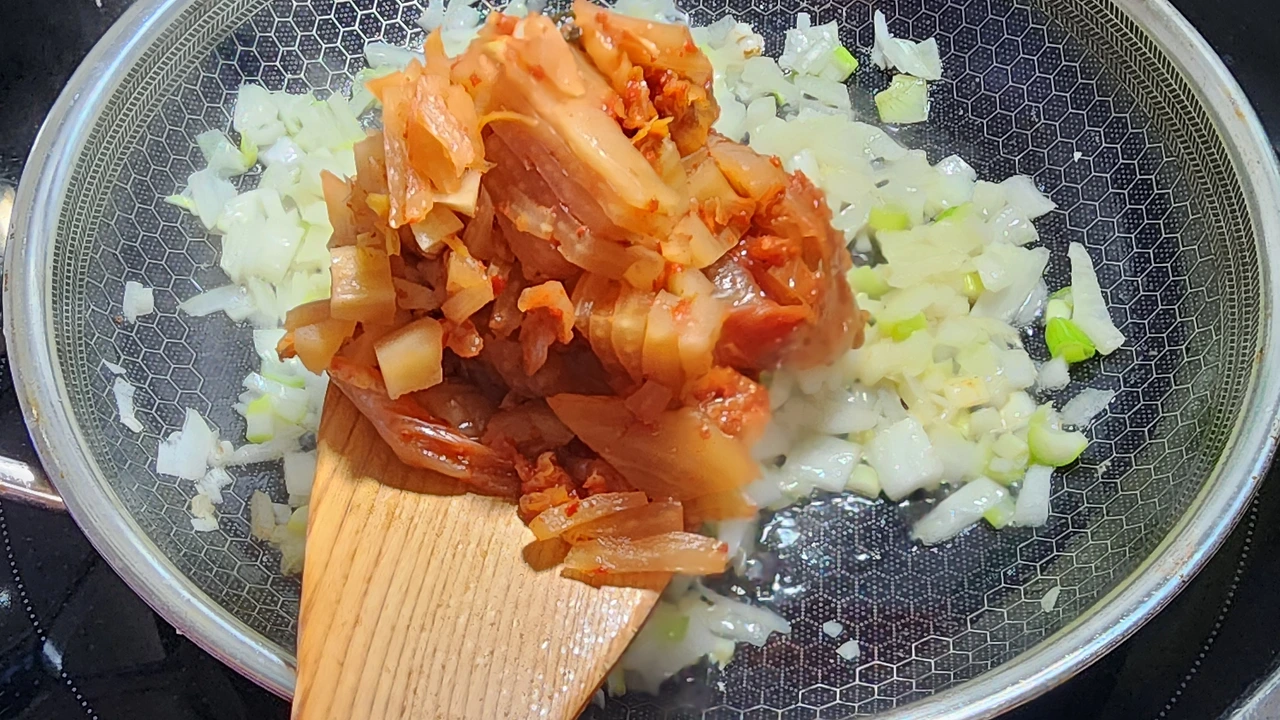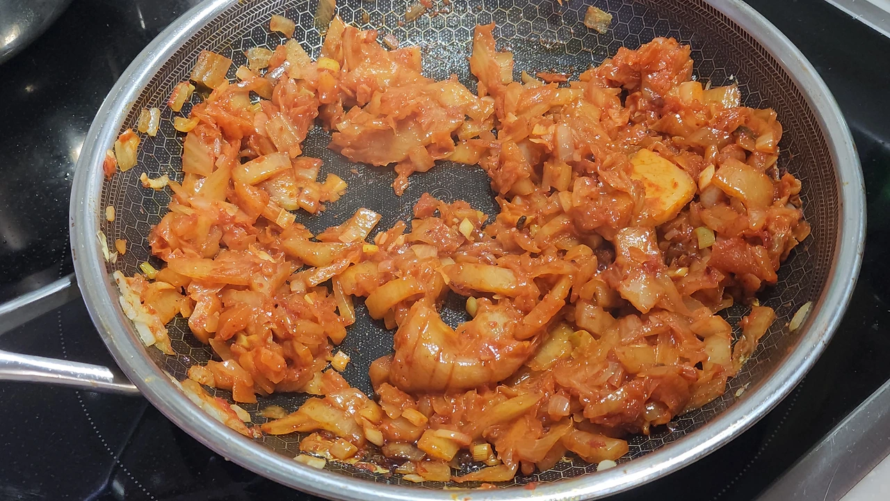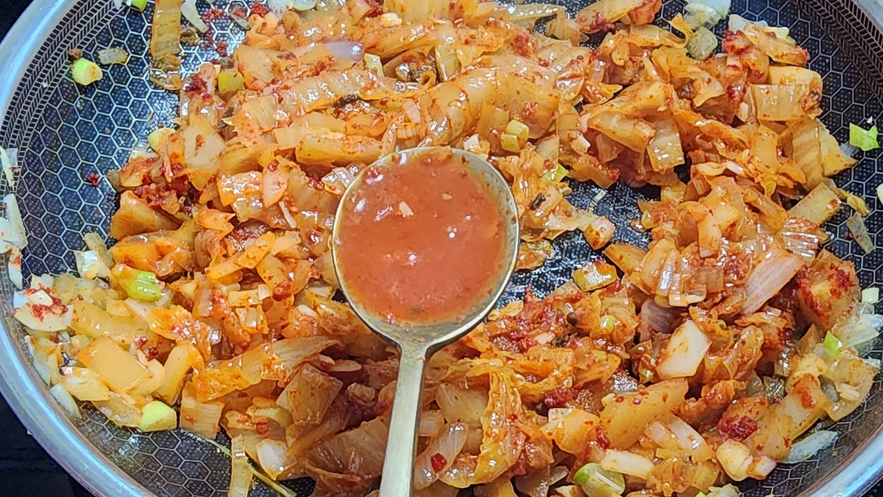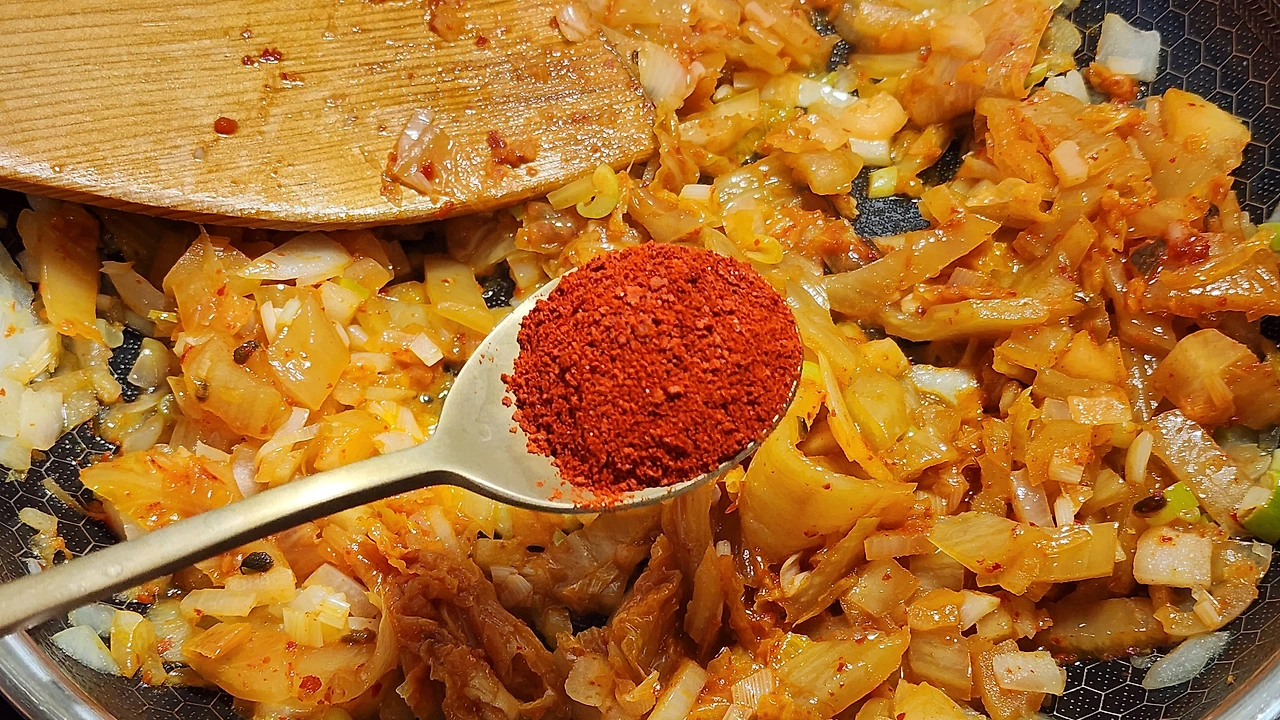 - 양파, 김치, 고춧가루 김칫국물 넣고 볶아준다
