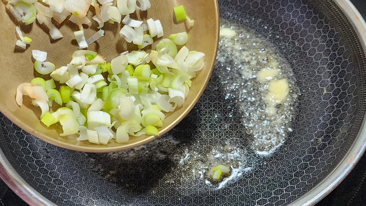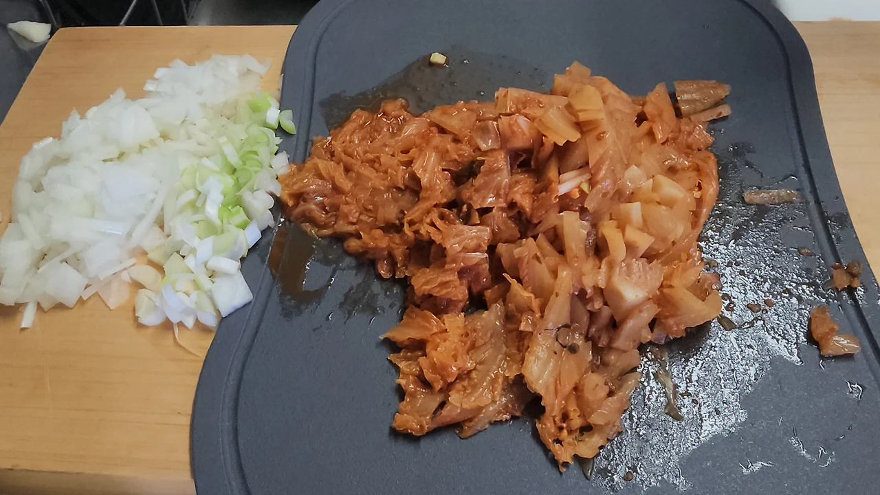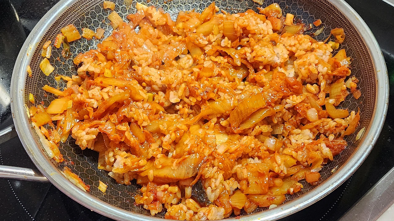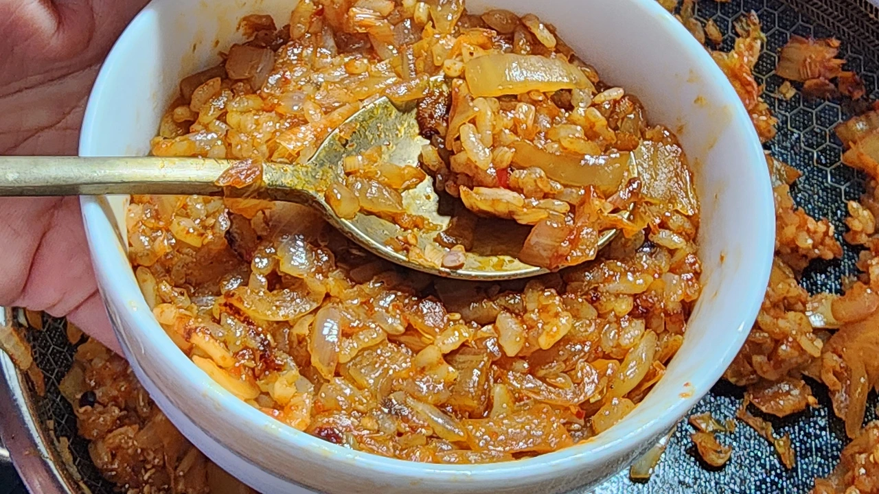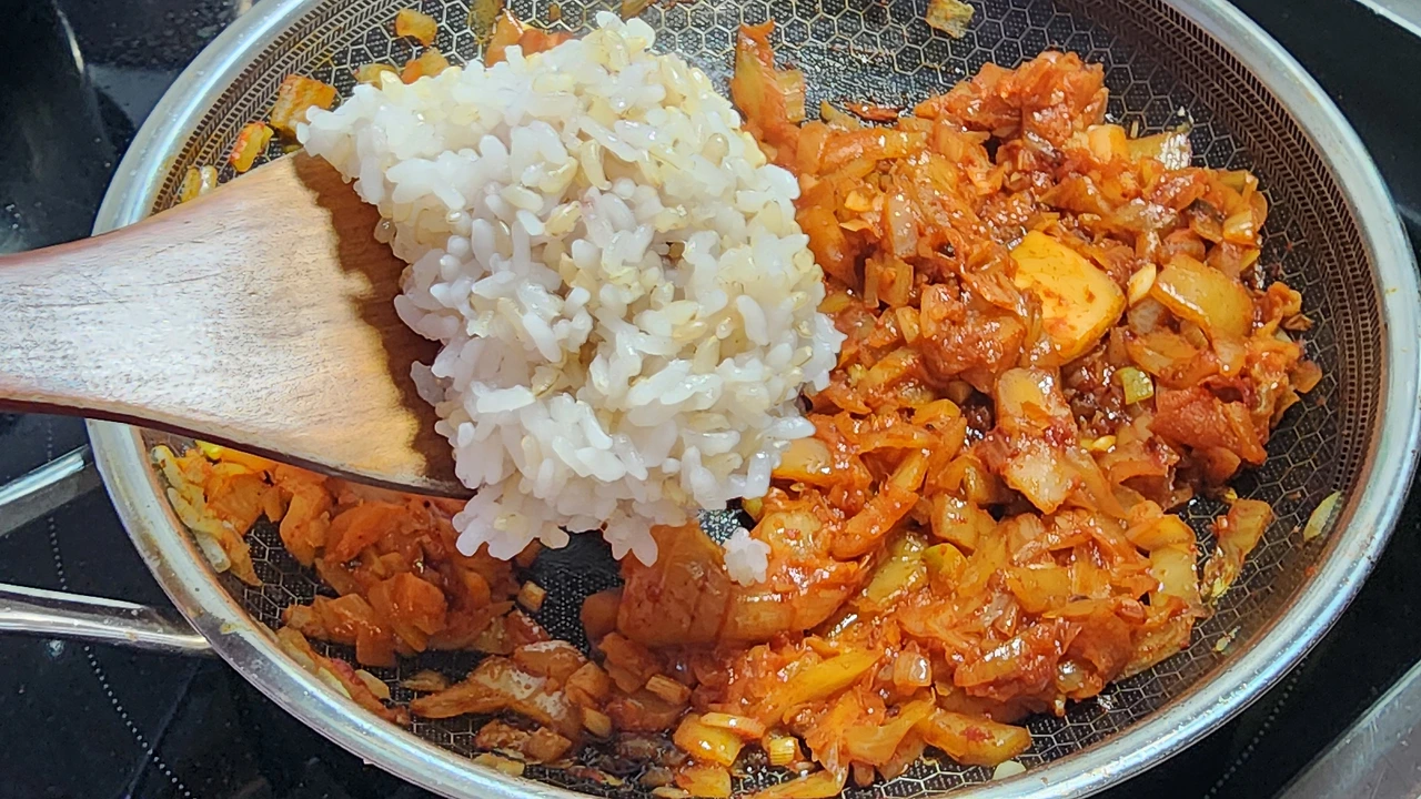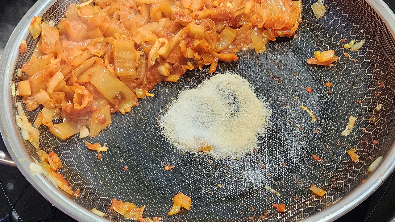 - 양파, 김치, 고춧가루 김칫국물 넣고 볶아준다