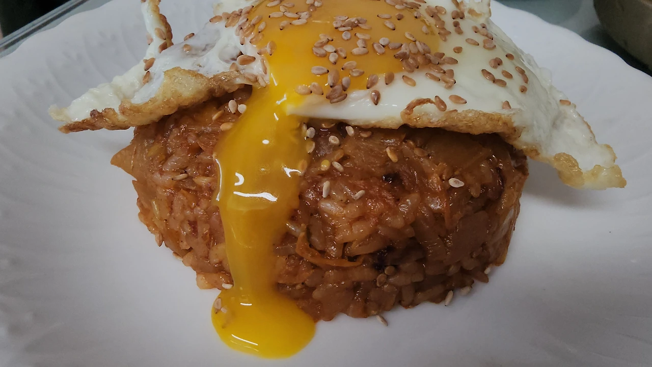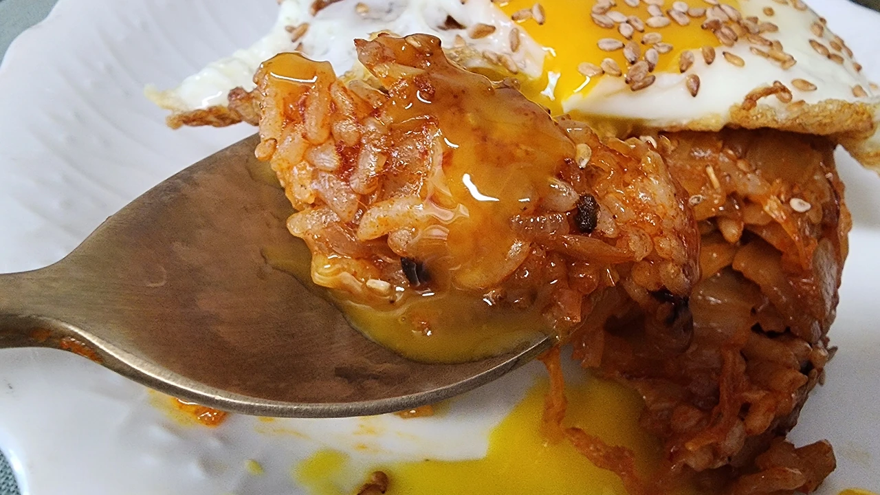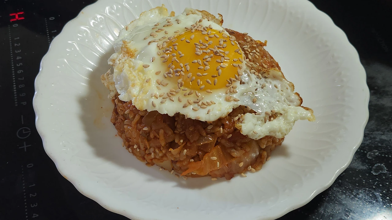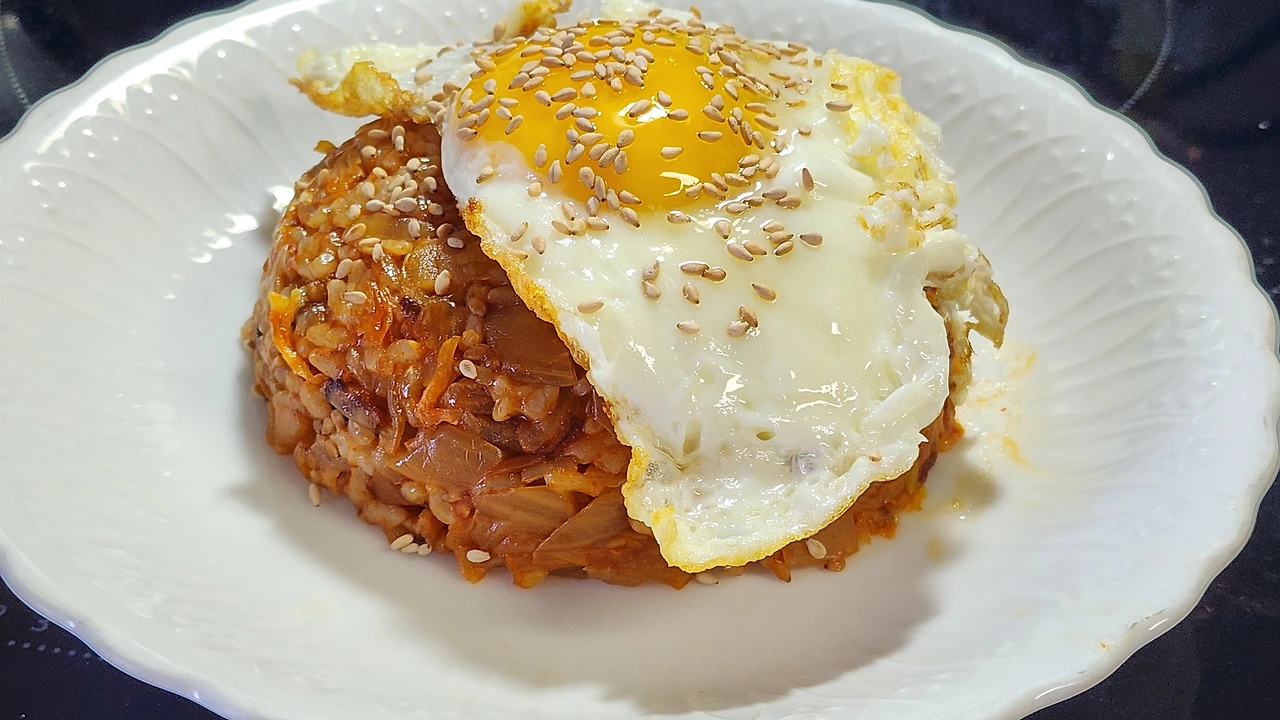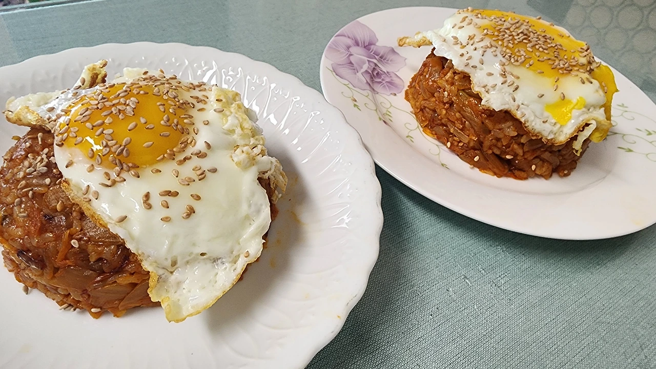 ♡재료;밥 1 공기, 김치 1/8쪽, 양파 1/2개, 대파 1/2대, 마요네즈 3숟가락 계란 2개, 고춧가루 2숟가락, 김칫국물 2숟가락 설탕 1숟가락 간장 1숟가락, 식용유 깨소금 약간