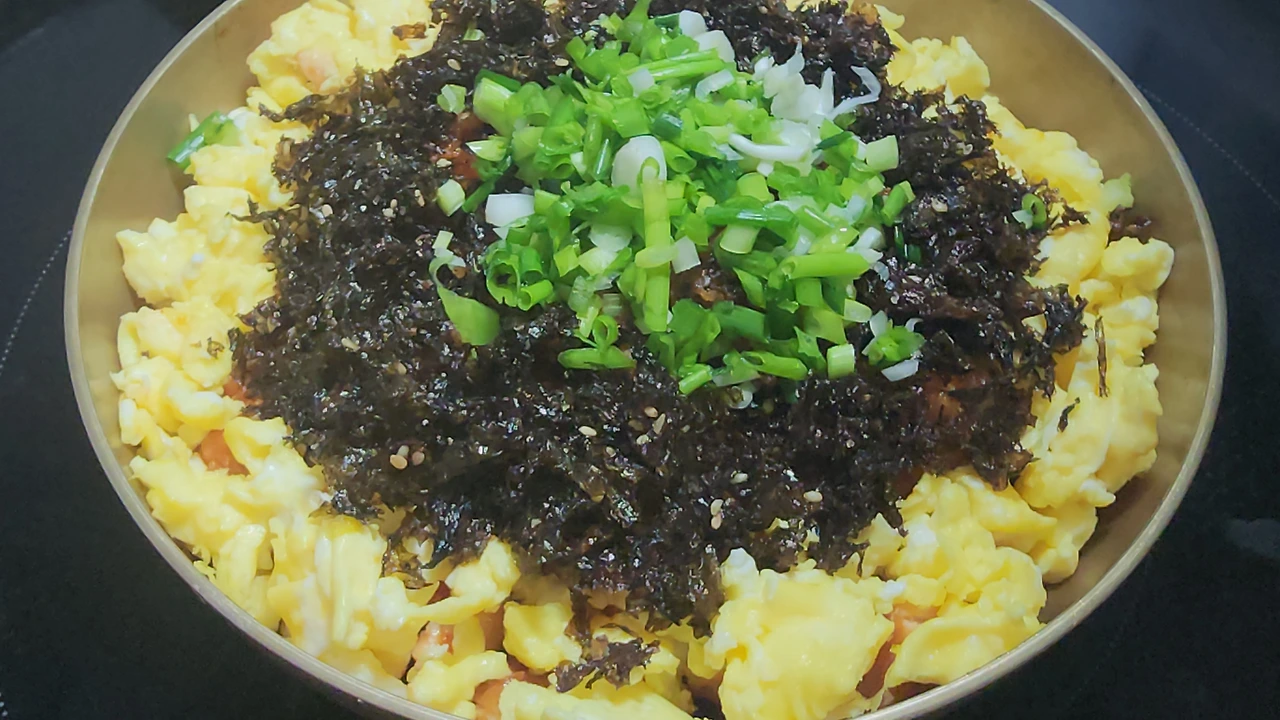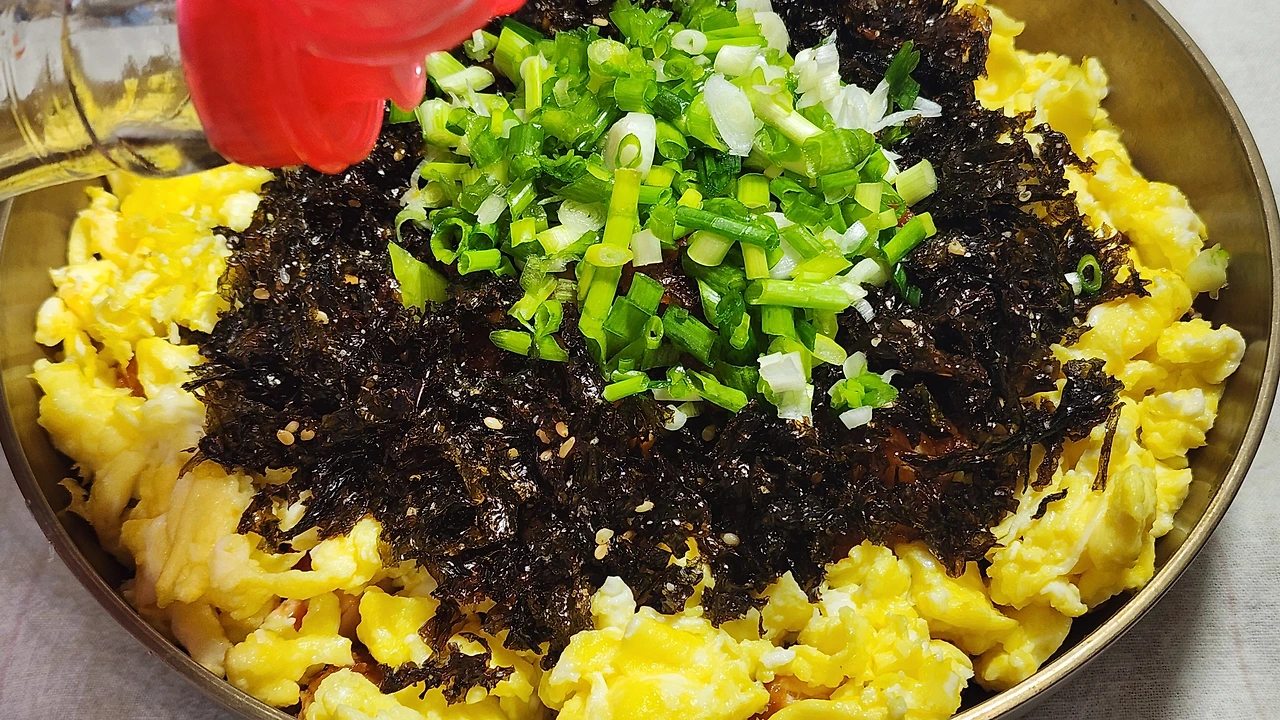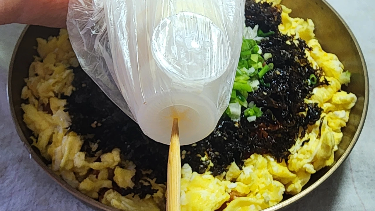 3. 밥, 치킨, 스크램블, 김가루, 실파, 참기름을 뿌려준다