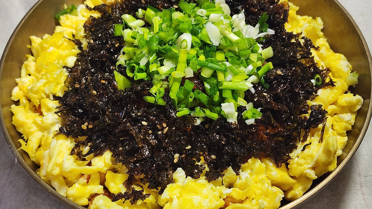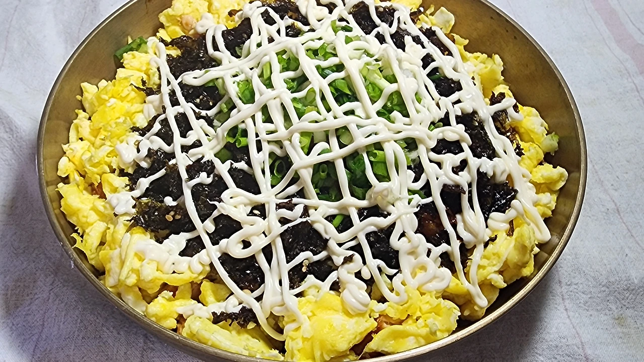 ♡재료: 치킨 5조각, 계란 3개, 김가루, 실파, 깨소금, 참기름, 소금, 식용유. 마요네즈 약간