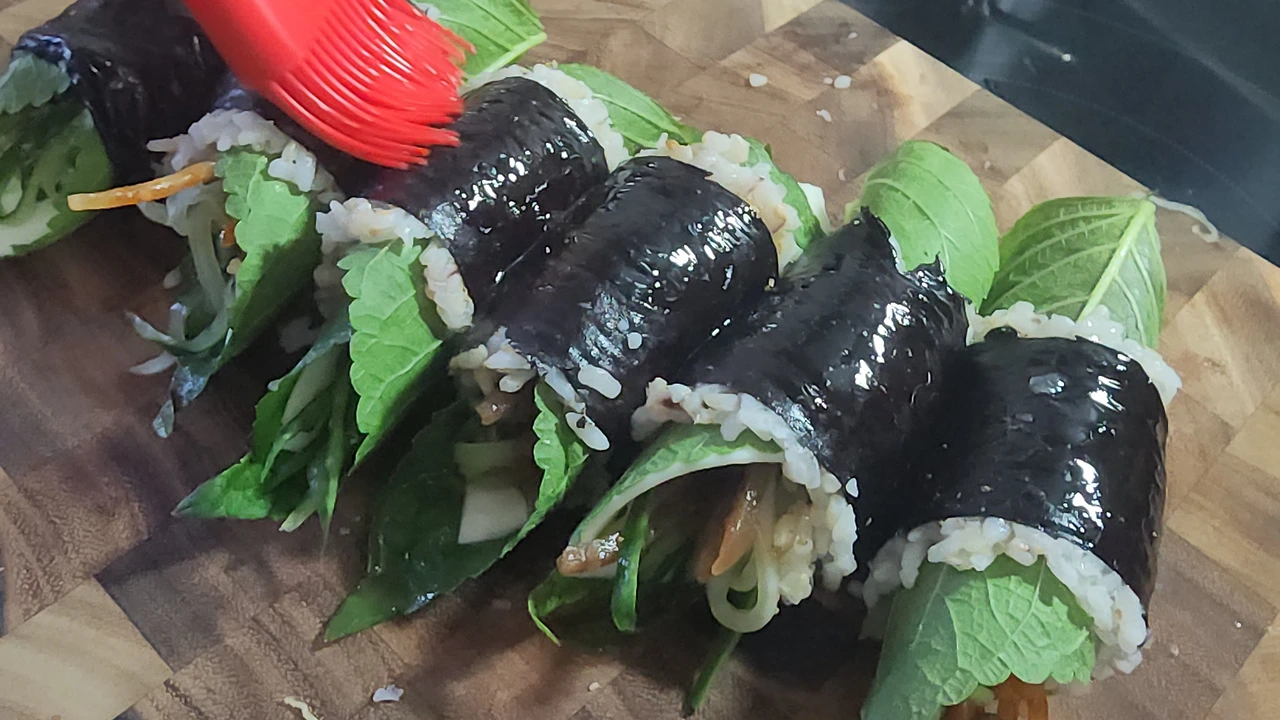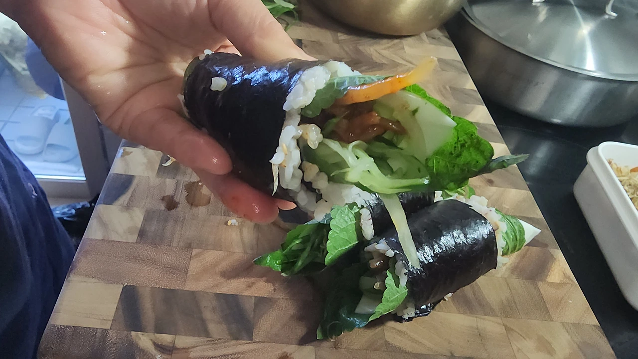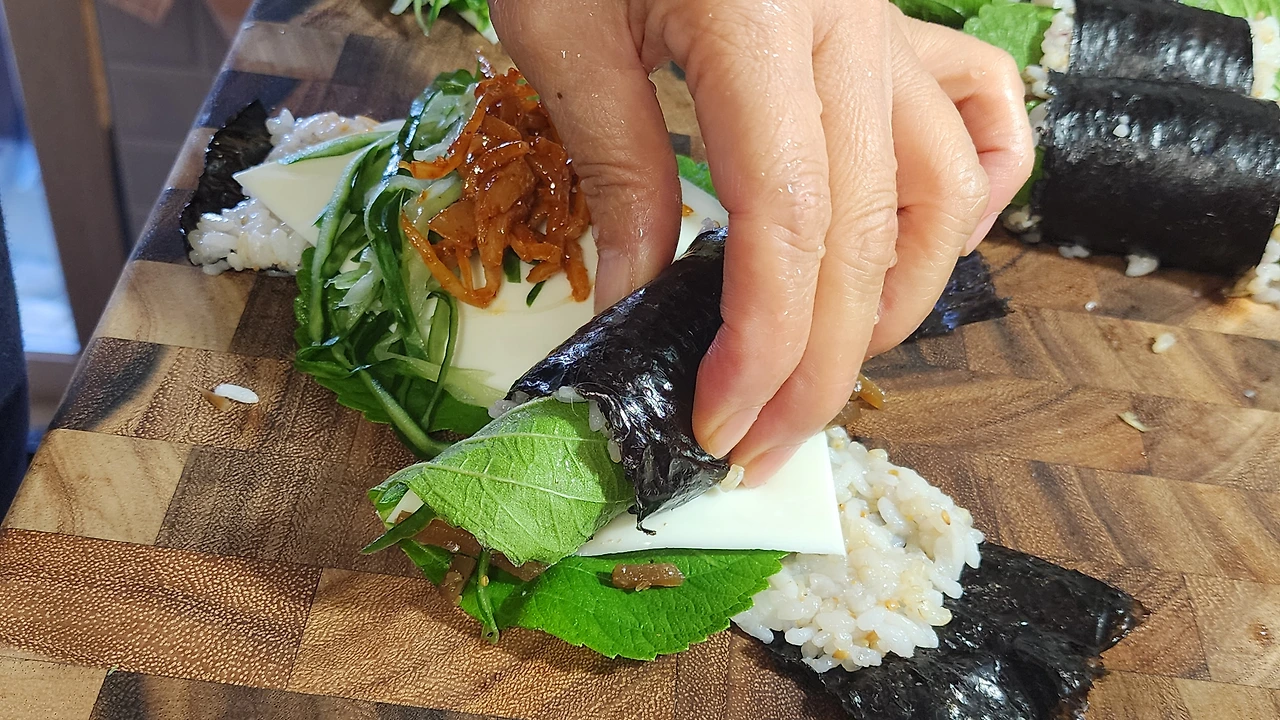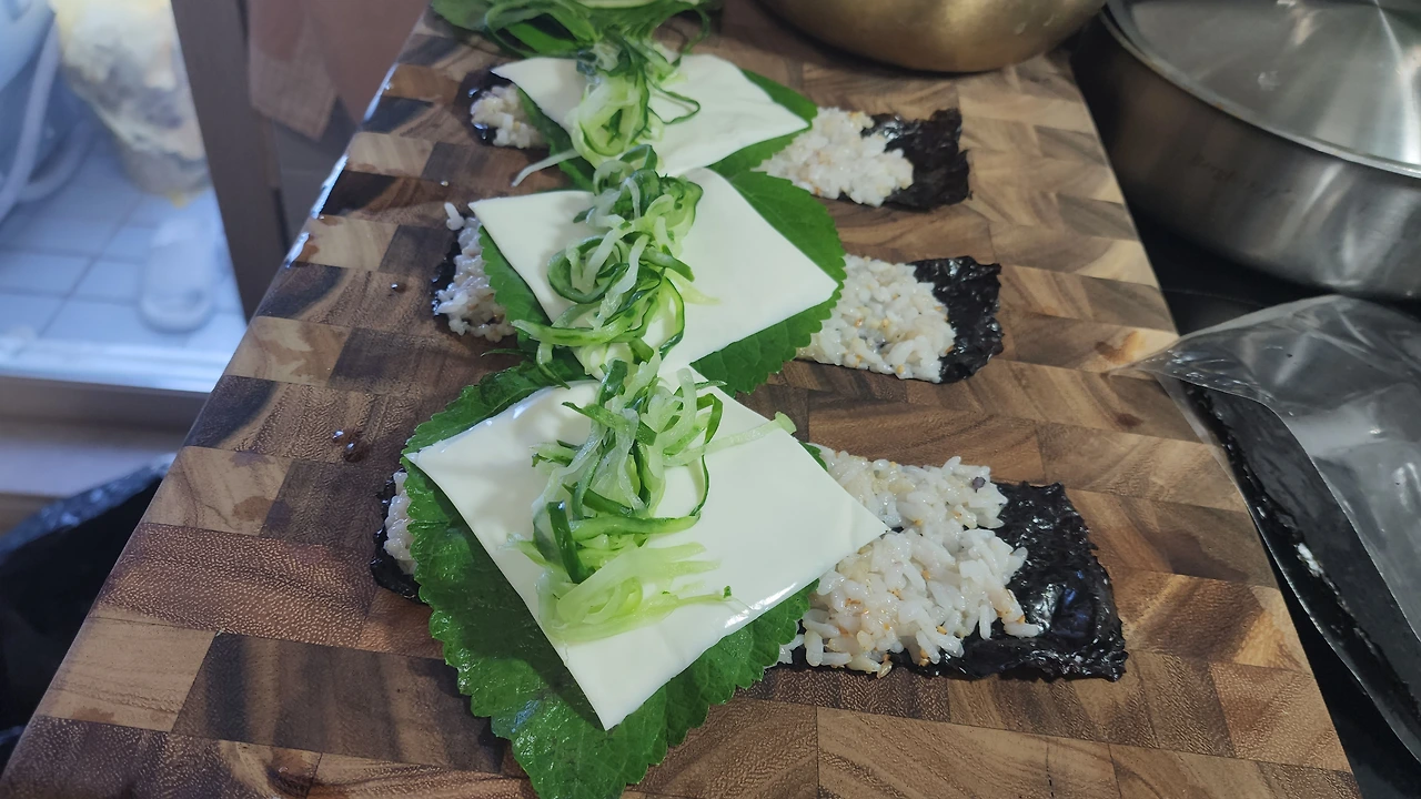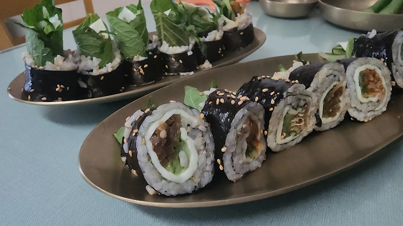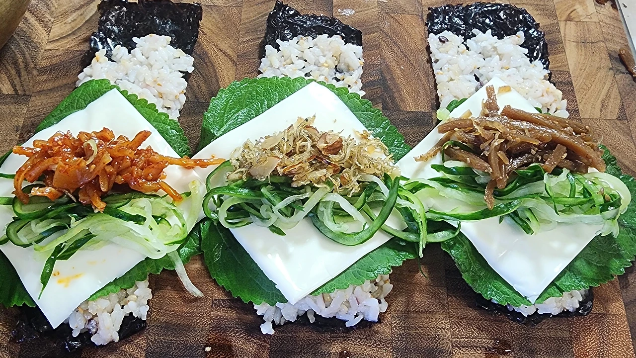 -밑반찬 3가지를 올려 돌돌 말아준다
