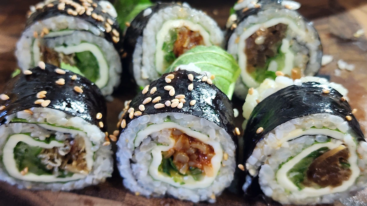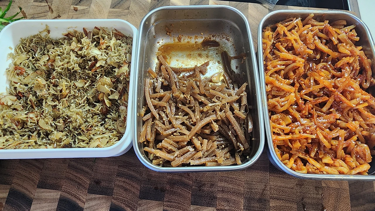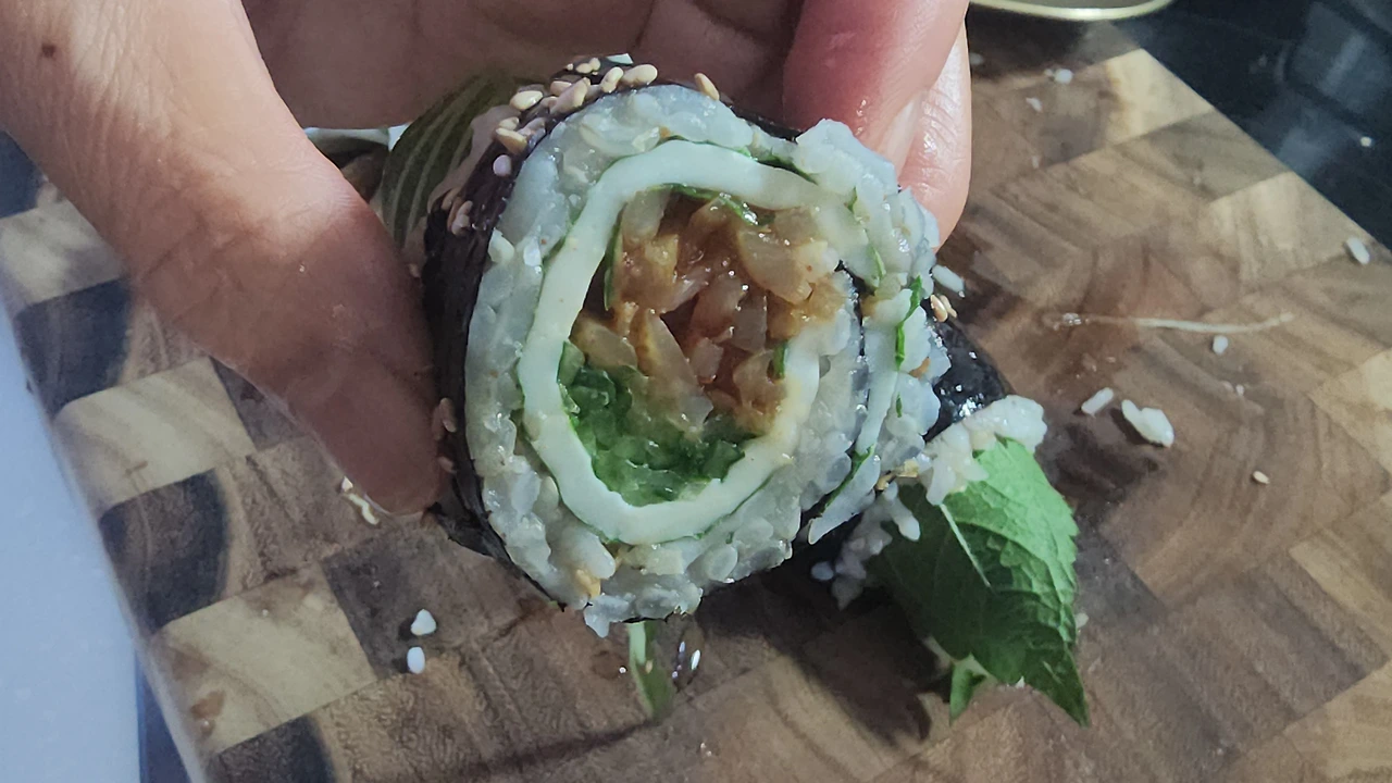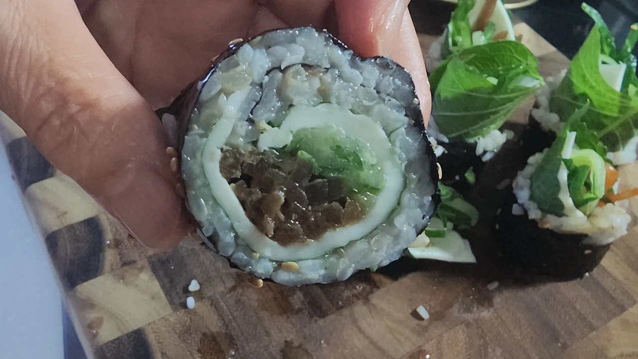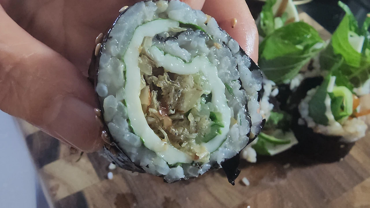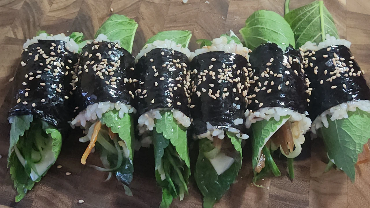 -밑반찬 3가지를 올려 돌돌 말아준다