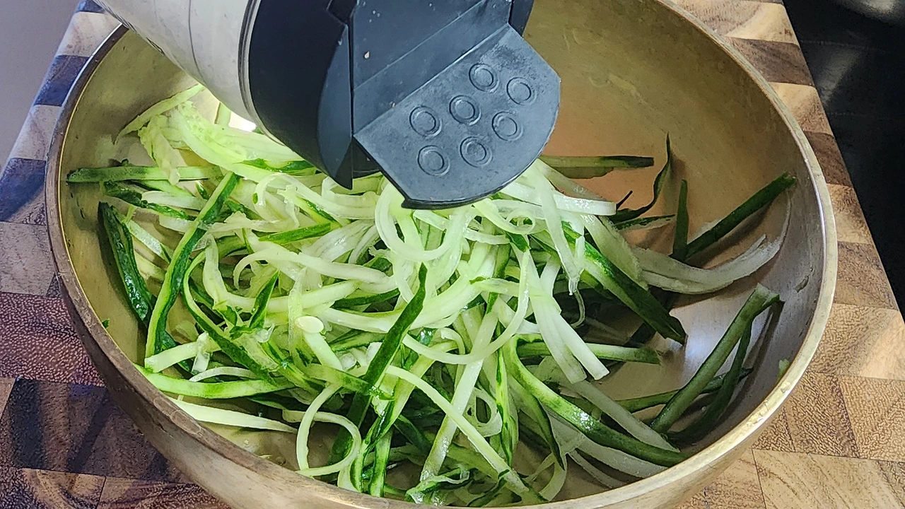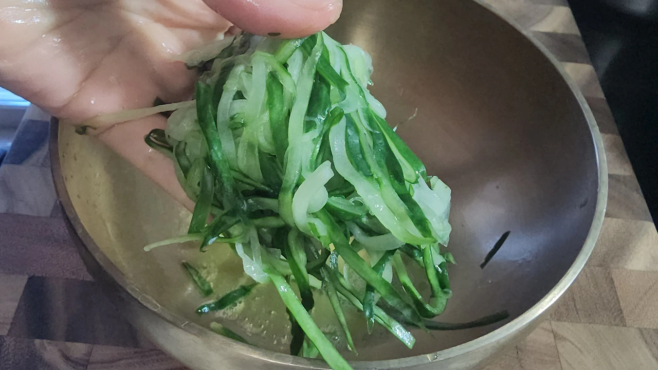 -오이는 채칼로 밀어 소금 간을 한 후 물기를 꽉 짜둔다