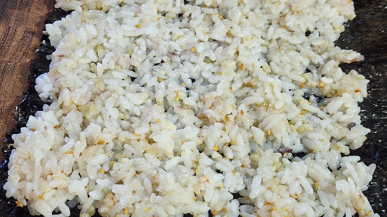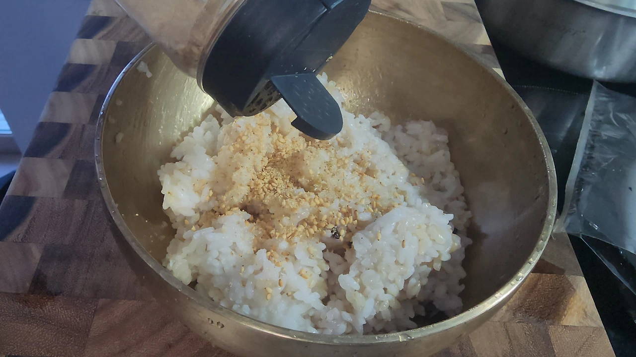 -밥, 참기름 깨소금 넣고 잘 섞어준다