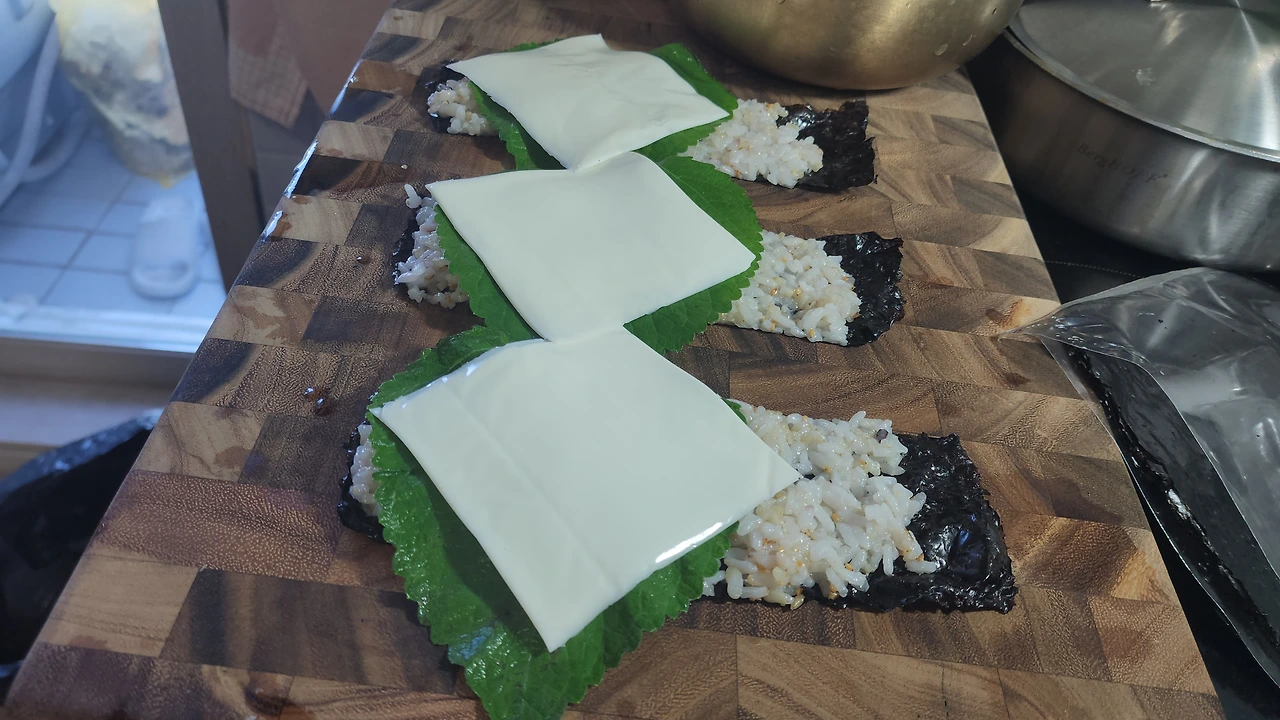 깻잎 6장, 체다치즈 6장, 소금 참기름 깨소금 약간