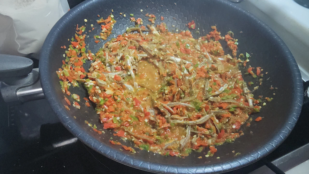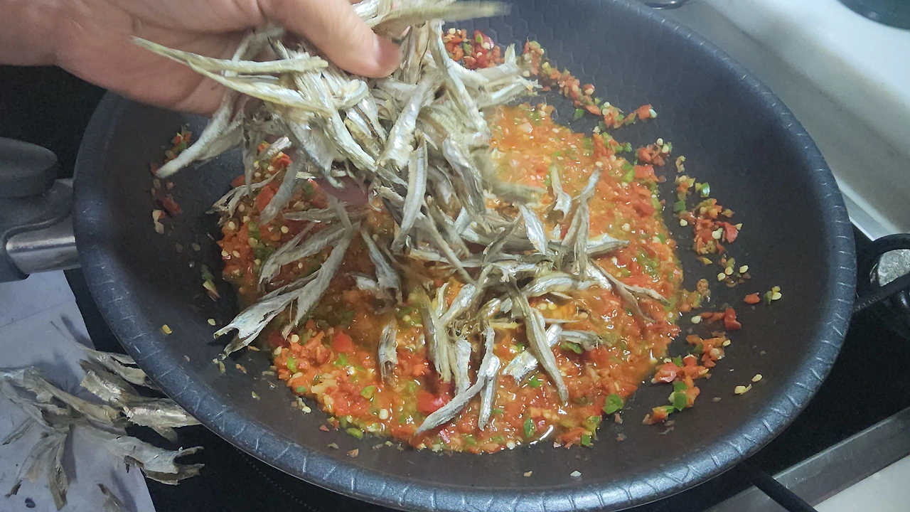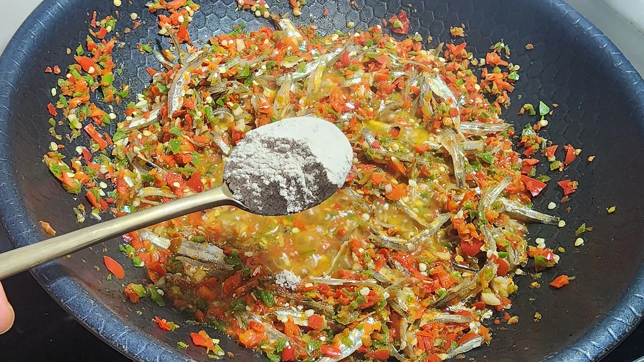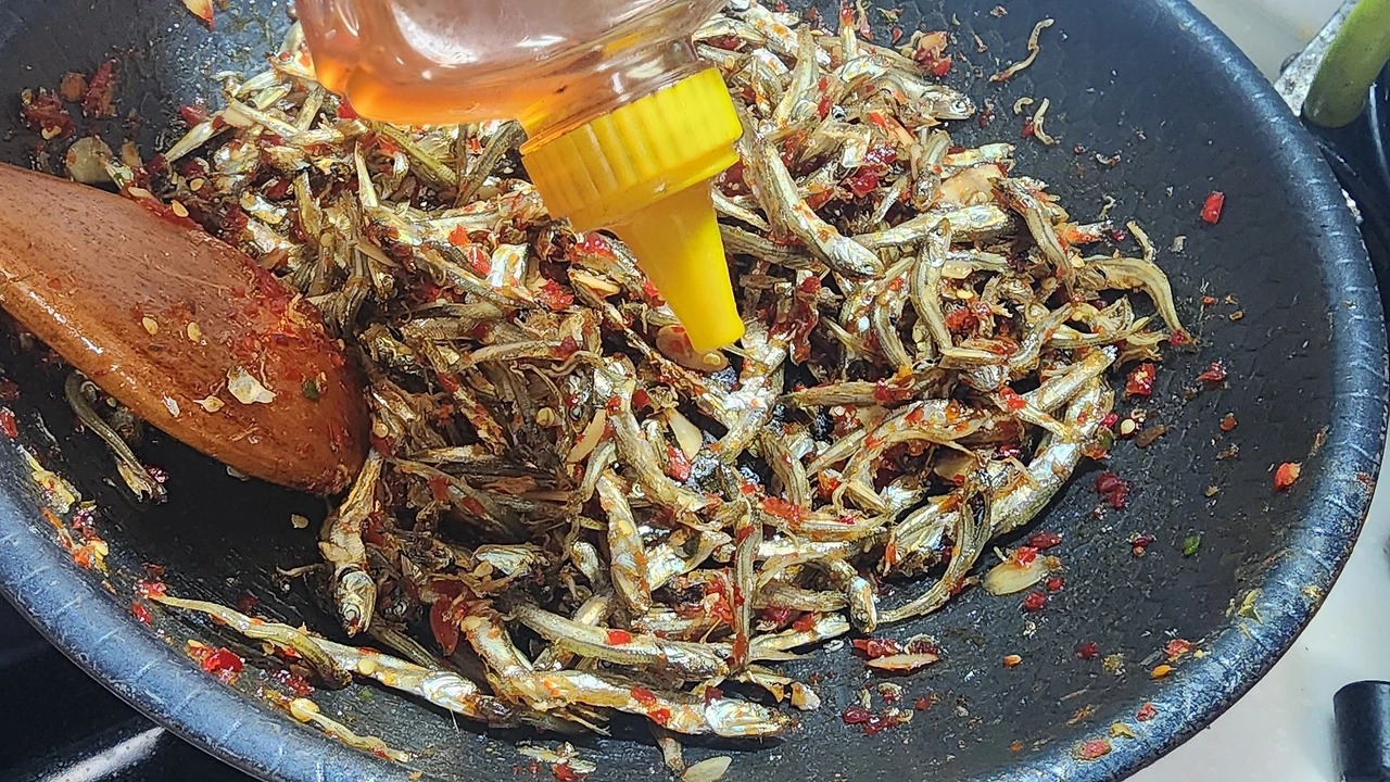 _멸치, 고추청을 넣고 볶아준다