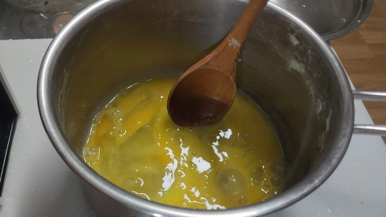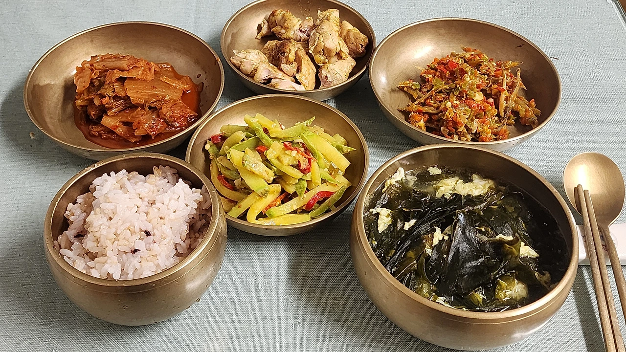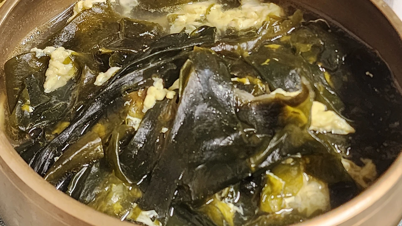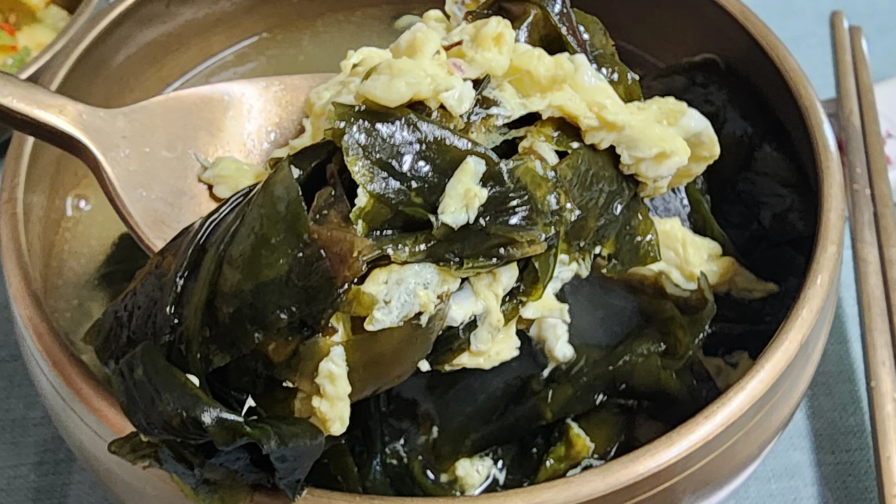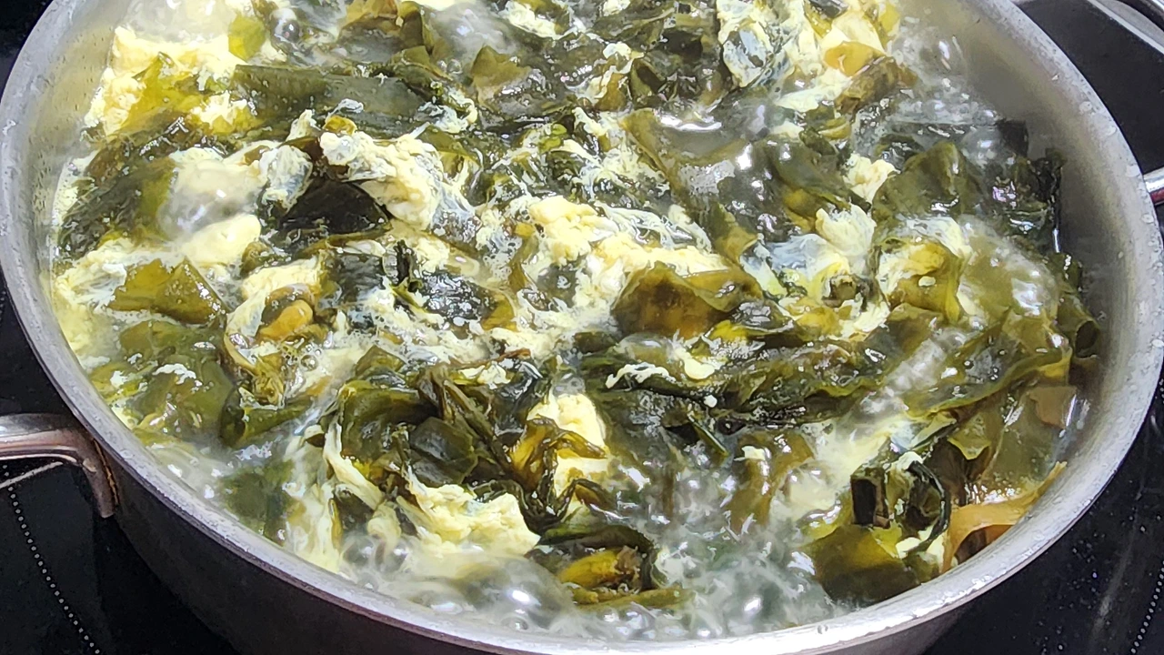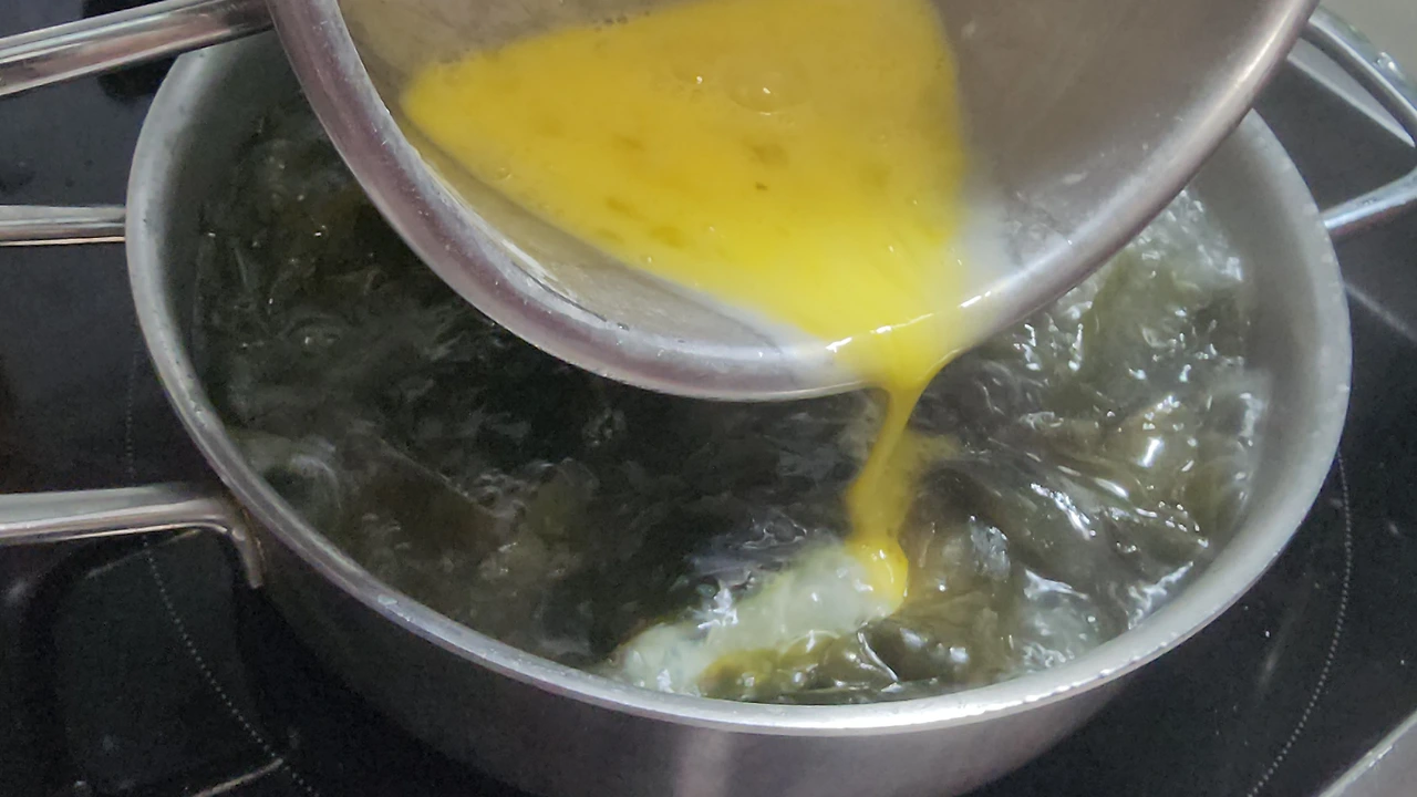 ○재료: 미역 한 줌, 계란 2개. 물 4컵, 동전육수 2개, 멸치액젓 2숟가락