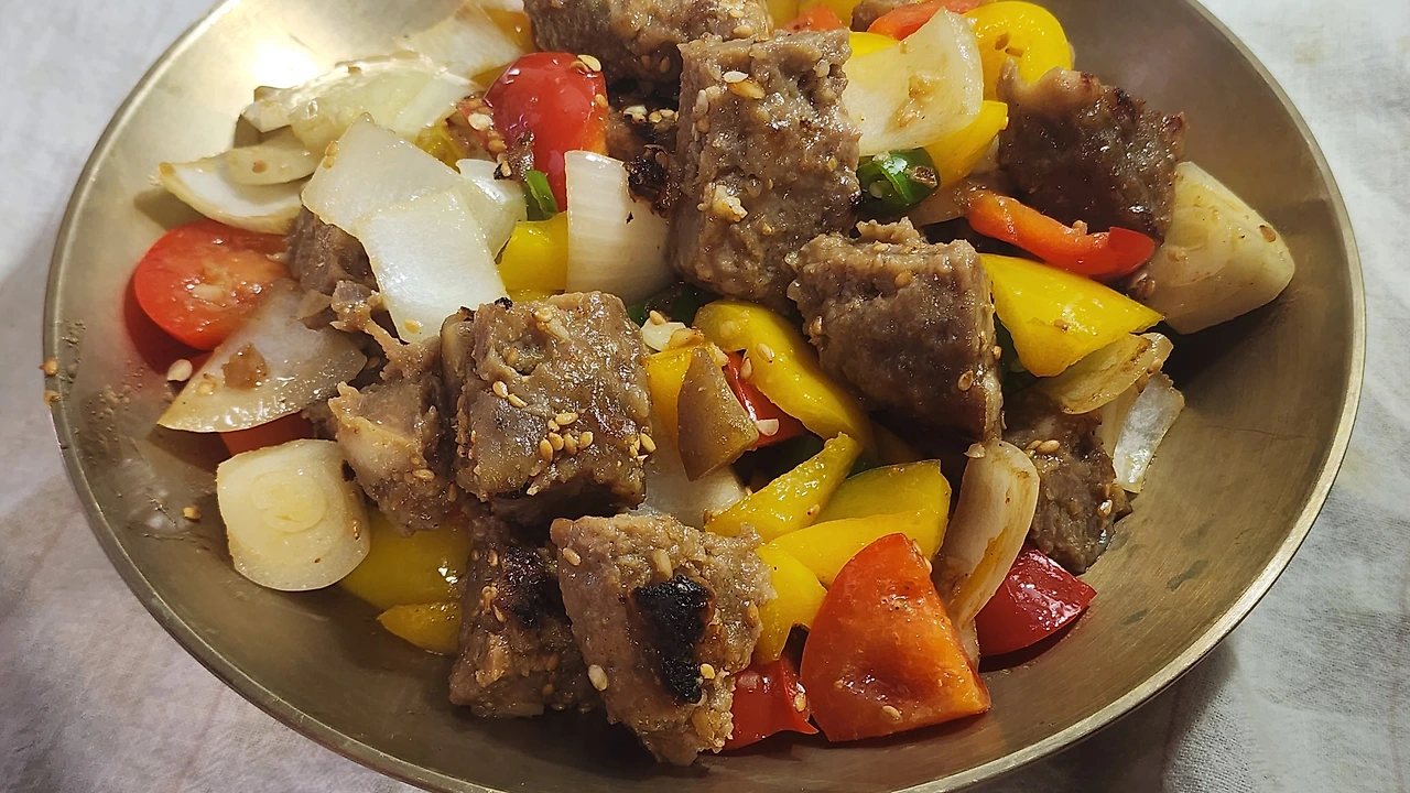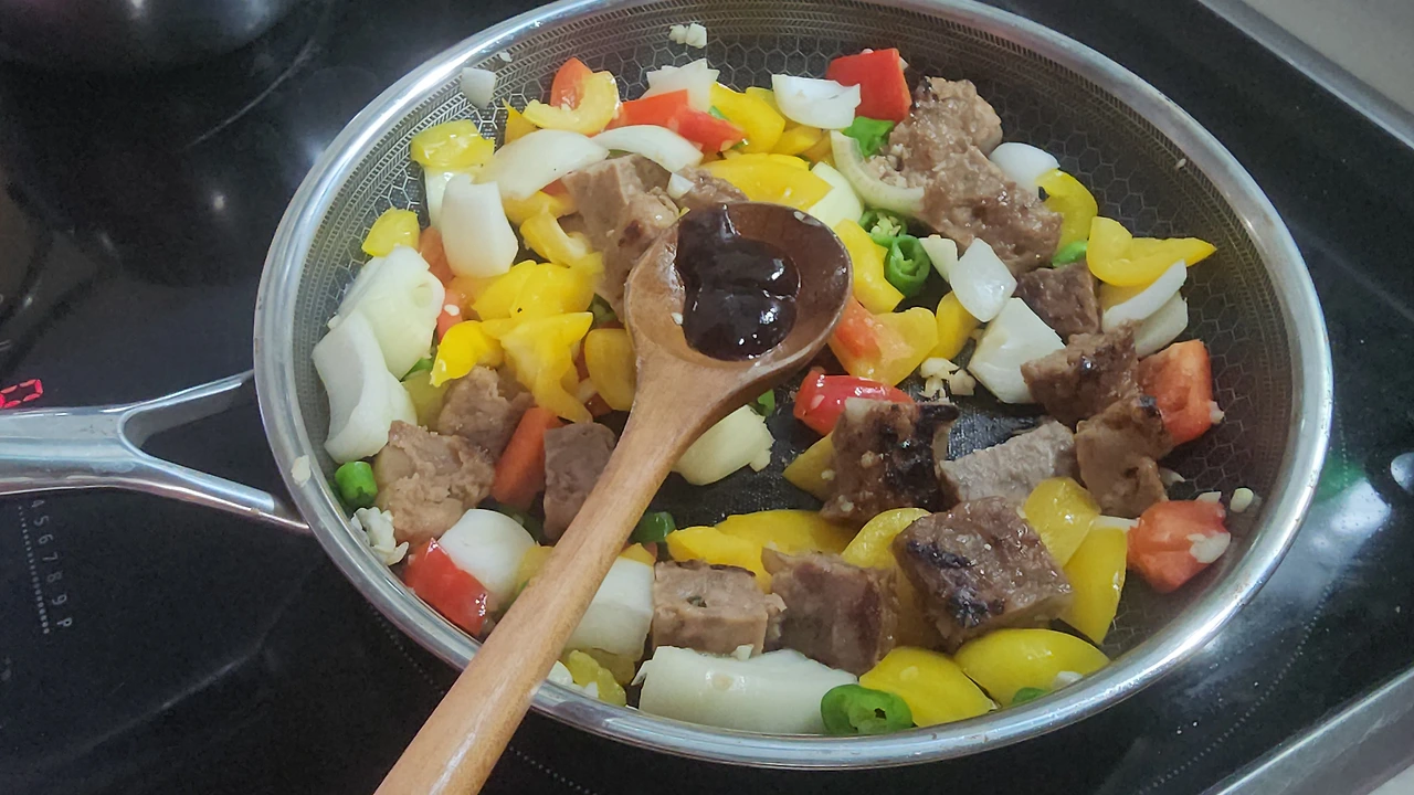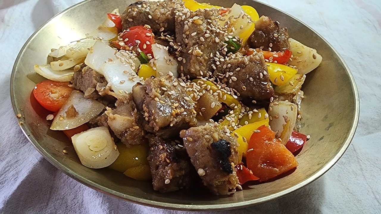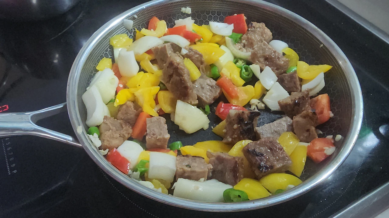 ●재료: 함박 2개, 미니파프리카 2개, 양파 1/2개, 청양초 2개, 굴소스 1숟가락 참기름 깨소금 식용유 마늘 약간