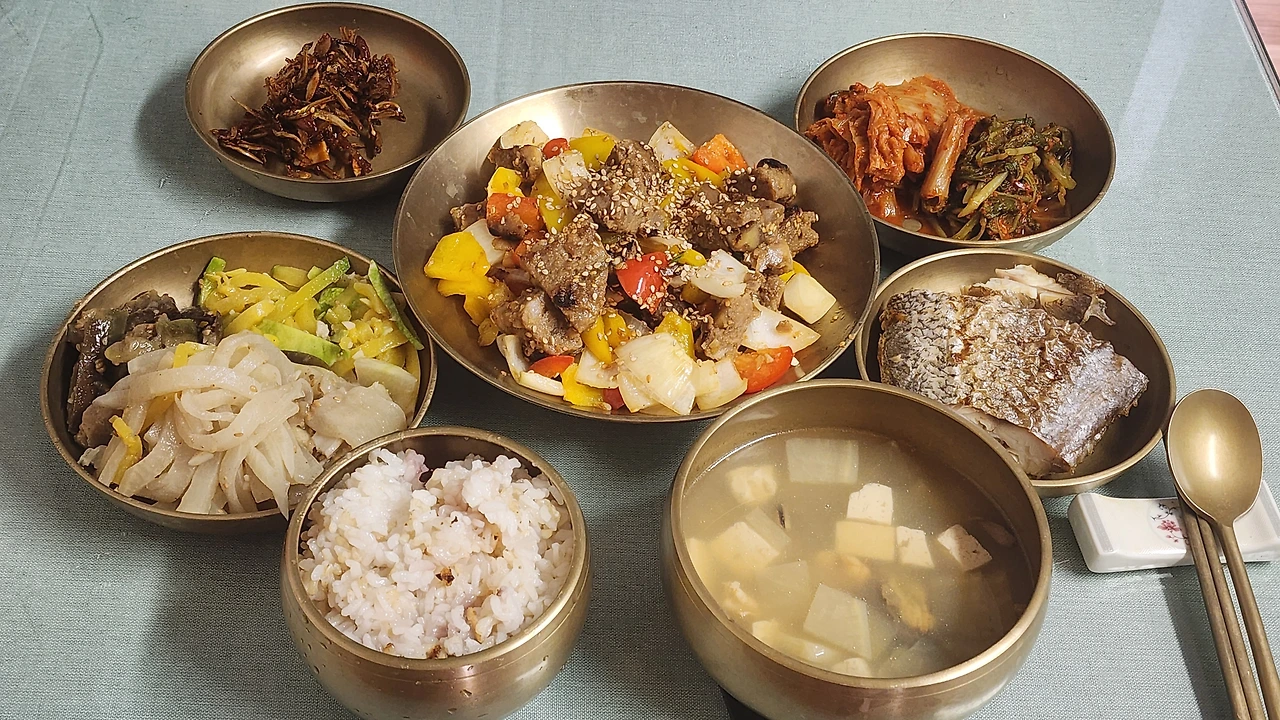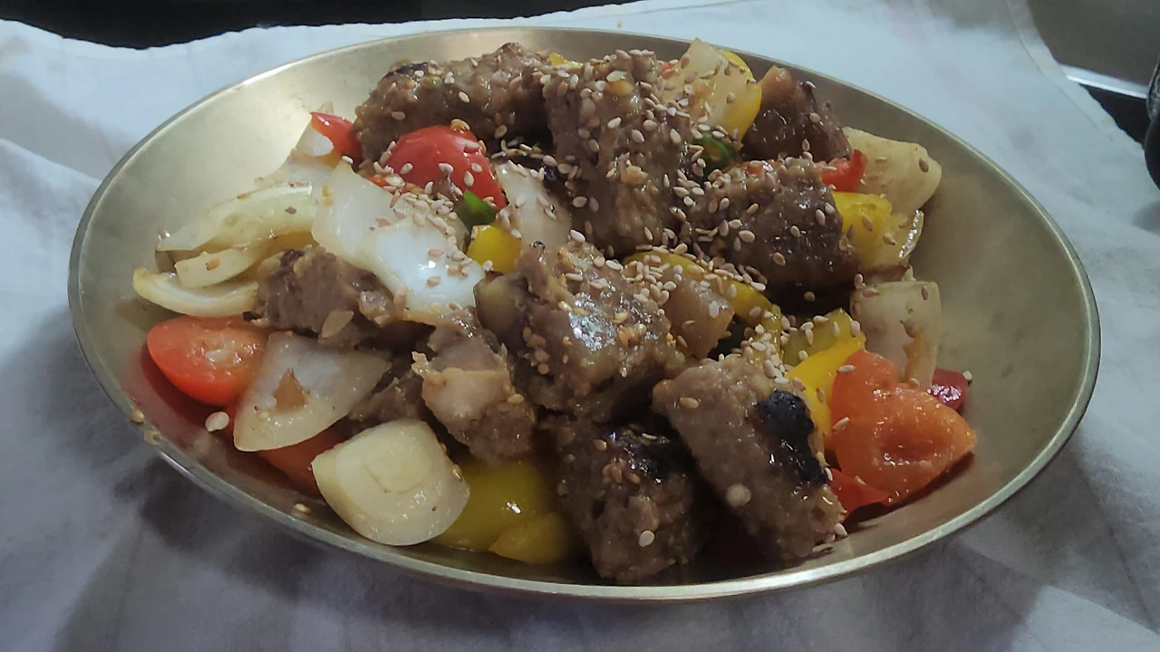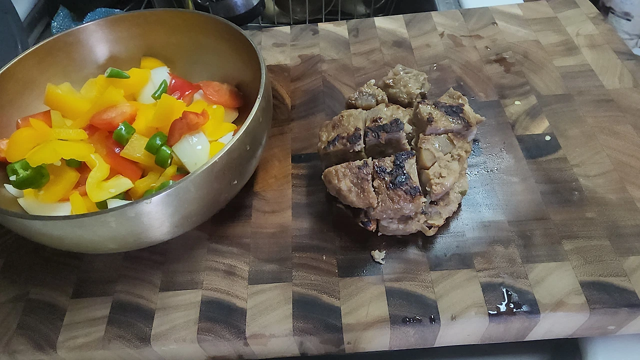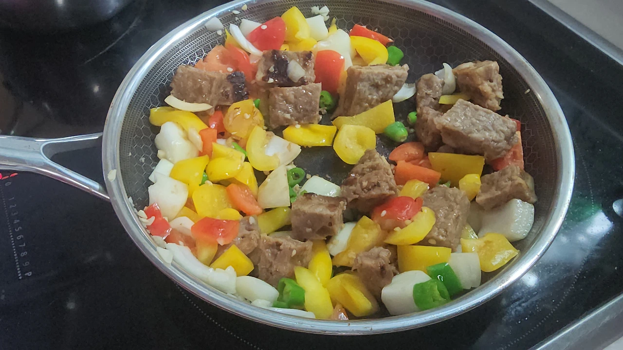 ●재료: 함박 2개, 미니파프리카 2개, 양파 1/2개, 청양초 2개, 굴소스 1숟가락 참기름 깨소금 식용유 마늘 약간