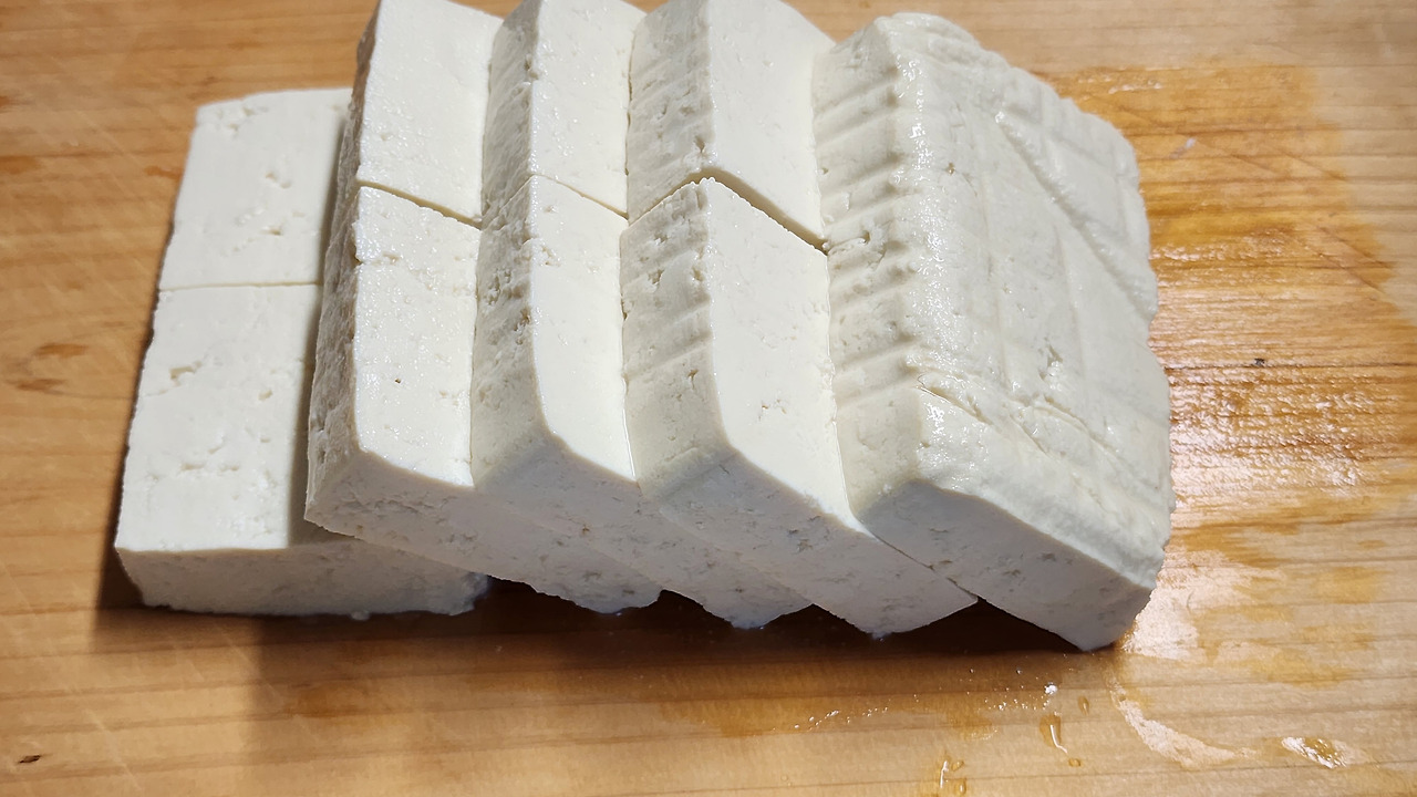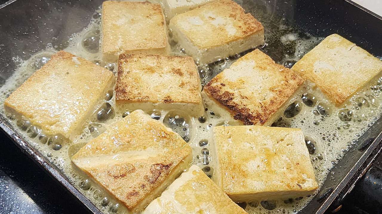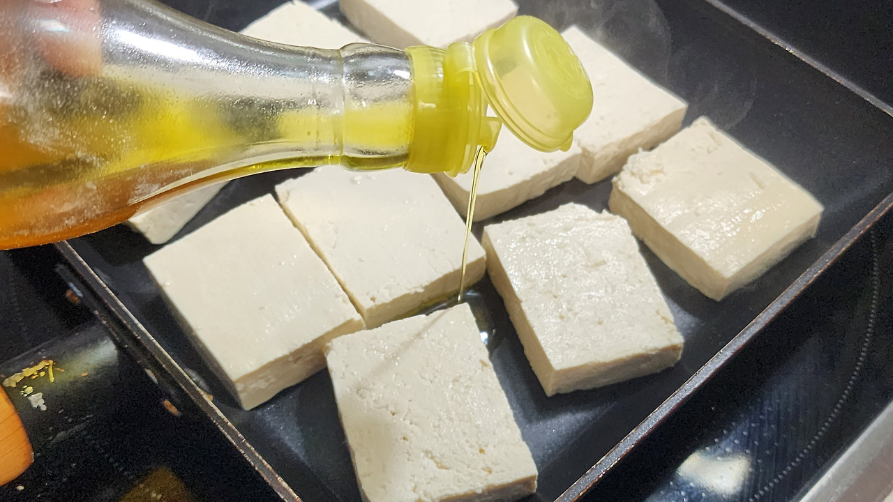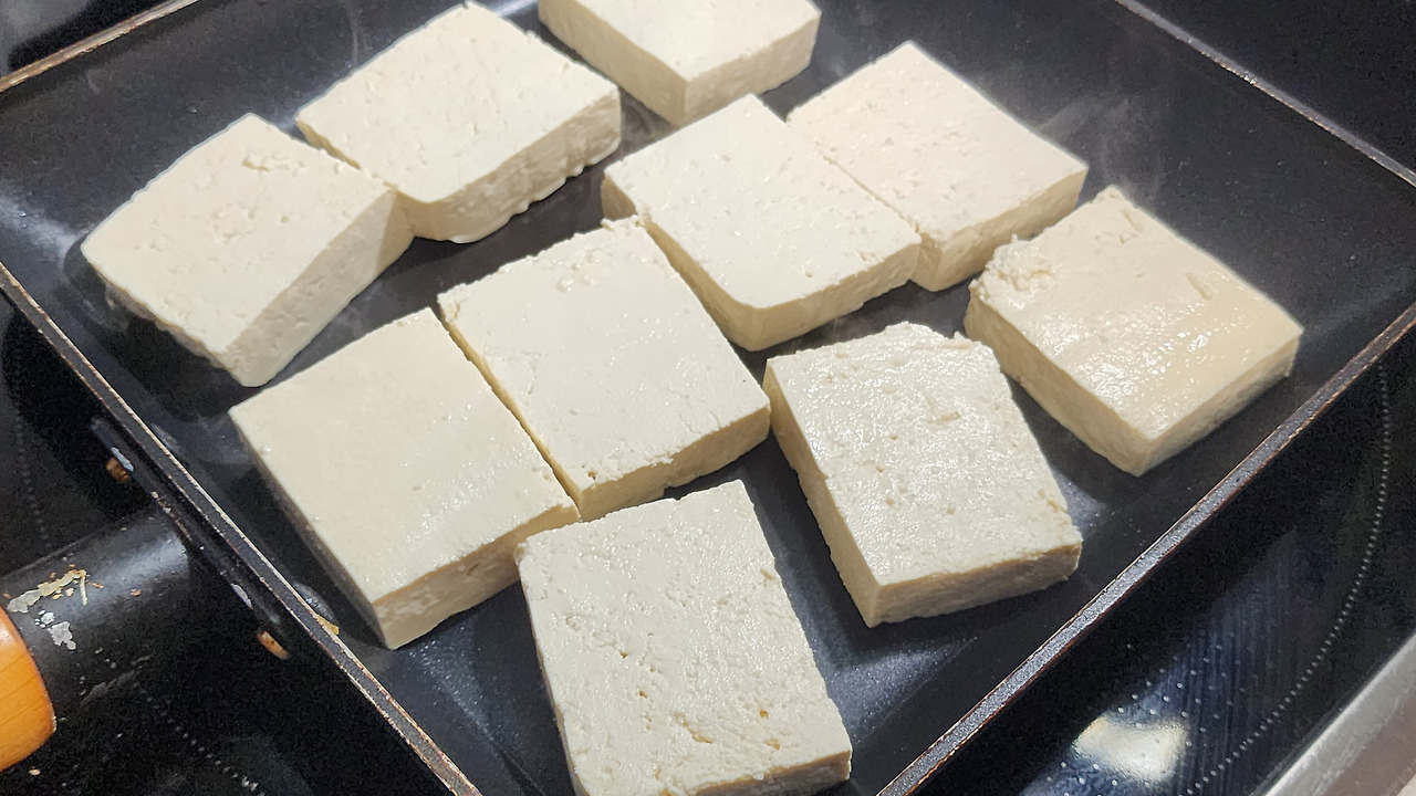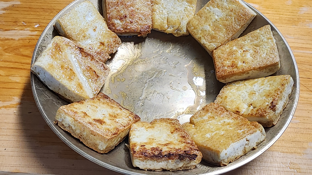 ㉡ 프라이팬에 두부를 넣고 들기름을 붓고 노릇노릇 구워준다.