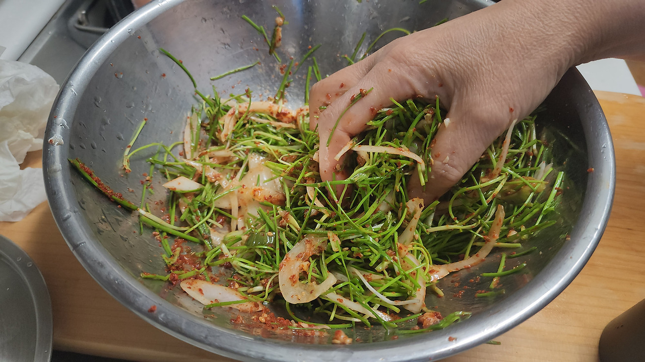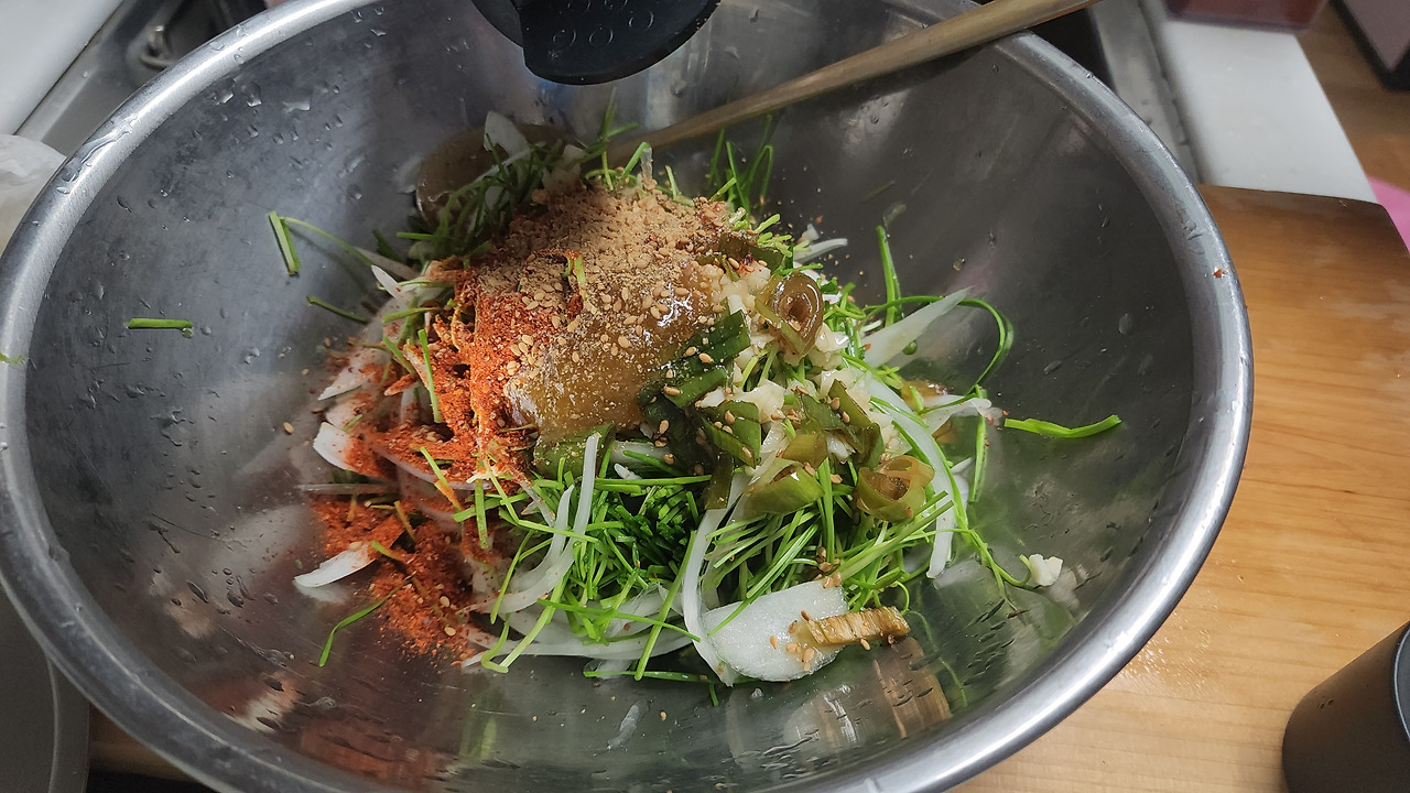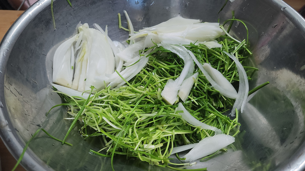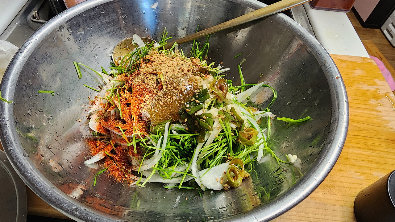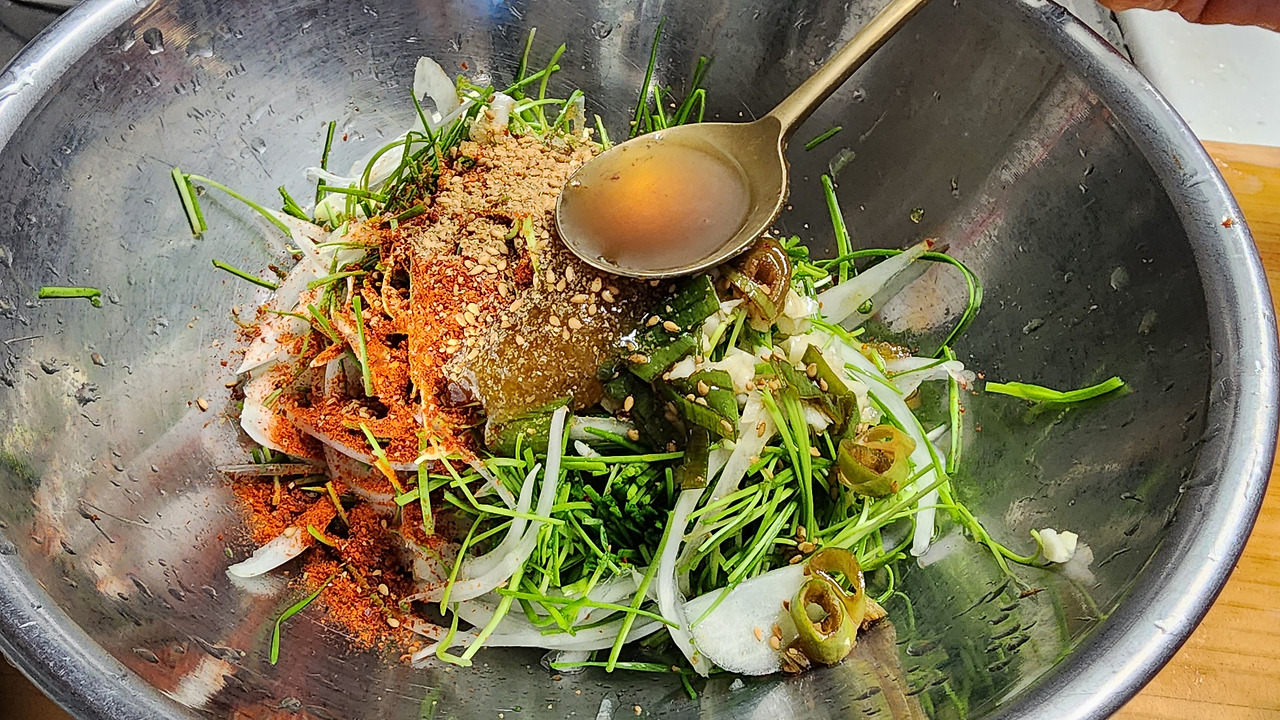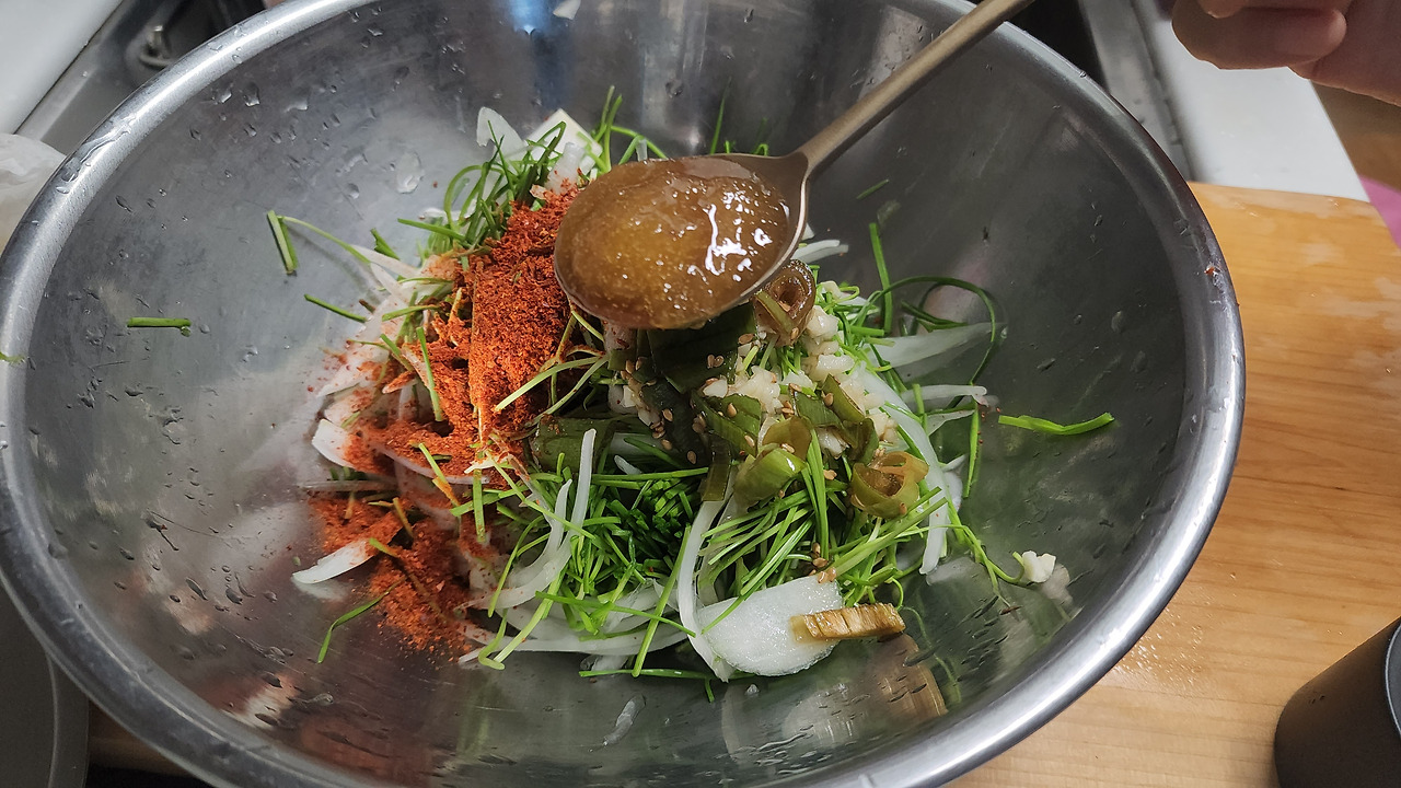 ㉢ 부추, 양파는 먹기좋게 썰어준 후 고춧가루, 마늘, 유자청, 멸치액젓, 식초, 참기름, 깨소금을 넣고 무쳐준다.