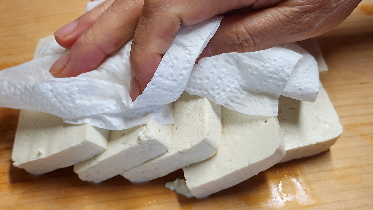 ㉠ 두부는 먹기좋은 크기로 썰어 종이타월로 물기를 제거한다.