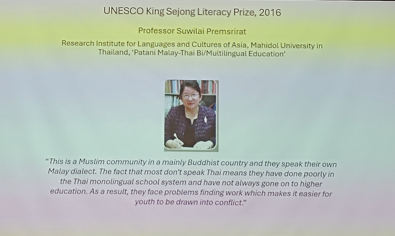 한 달 전인 지난 9월, 폴란드의 서쪽 도시 포즈난에서 열린 국제학술대회에서 호주 멜버른대학의 조셉 로 비안코(Joseph Lo Bianco) 교수의 기조 강연을 들을 기회가 있었다. 비안코 교수는 언어계획, 이중언어 교육, 문해학 전문가로 말레이시아, 미얀마, 태국 등 동남아시아의 언어 갈등 문제를 평화적으로 해결하는 방법을 모색해 온 분이다. 비안코 교수가 강연 도중 '유네스코 세종대왕 문해상'(UNESCO King Sejong Literacy Prize)을 언급했다. 귀가 쫑긋 섰다. 태국 마히돌대학 아시아언어문화연구소가 개발한이중언어교육 프로그램이 "중요한" 유네스코 세종대왕 문해상을 타는 쾌거를 이루었다고 소개했다.