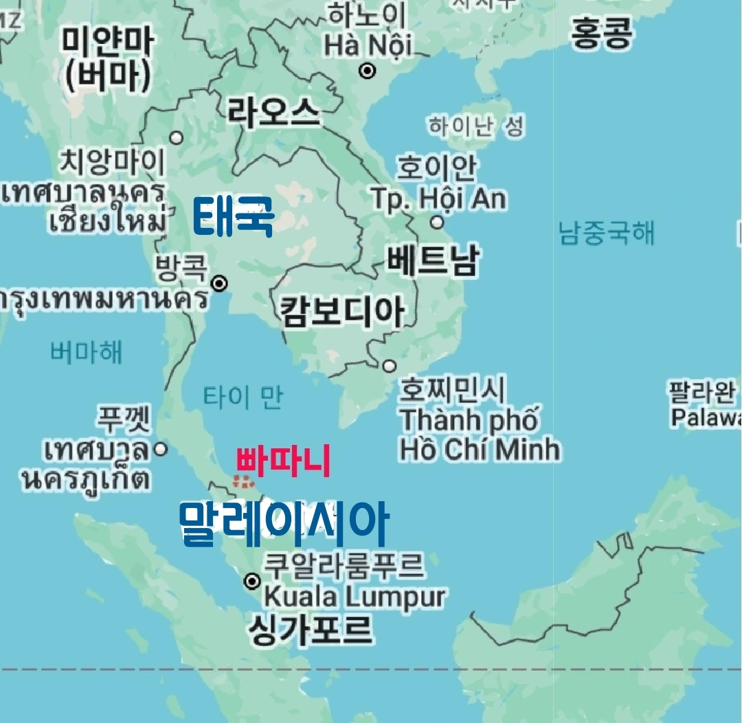 태국의 남쪽, 말레이시아 국경 근처에 위치한 빠따니 (출처: 구글 지도)