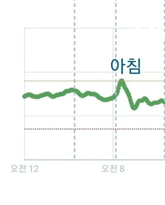 아침에 삶은 달걀 1개, 생오이와 방울토마토. 양배추, 브로콜리, 청경채, 팽이버섯과 두부를 끓는 물에 살짝 데쳐 올리브오일에 찍어 먹었다. 현미밥에 검은콩가루를 넣고 걸쭉하게 끓인 죽을 아침마다 맛있게 먹고 있었는데 죽이 당을 빨리 높인다고 해서 요즘은 당과 무관한 남편만 가끔씩 먹는다. 아무래도 측정기 눈치를 많이 보게 된다. 아침 식사 후 혈당 앱을 열어 보니 그래프에 뾰족한 산 같은 봉우리 하나가 만들어졌다.
