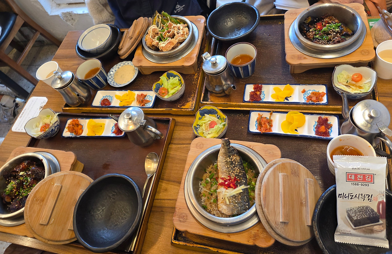 메뉴가 너무 많아 무얼 고를지 고민하다가 생선을 좋아하는 나는 고등어가 올라간 솥밥, 두 사람은 가지 솥밥, 그리고 한 사람은 닭튀김 솥밥을 시켰다. 네 사람 모두 엄지척을 하며 먹었다. 아침에 책 읽기로 에너지를 쓴 데다 음식도 우리 입맛에 맞아 네 사람 모두 맛있게 그릇을 비웠다.