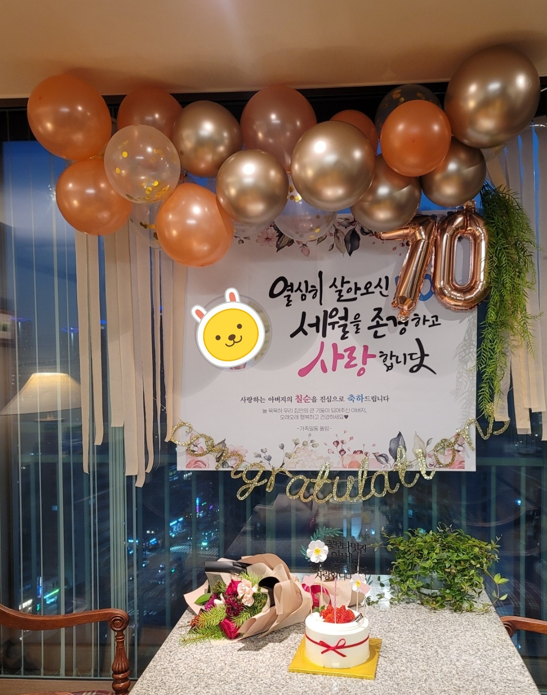 거실에 들어서니 핑크빛, 보랏빛, 주황빛 풍선들이 천장에 매달려 있고, 축하 메시지가 쓰인 사각형 배너가 유리창에 드리워져 있었다. 배너 하단에는 금빛 알파벳으로 조합된 congratulations가 너울거렸다. "며느리 덕에 이런 멋진 이벤트도 경험하네!" 우리 부부는 탄성을 질렀다. 전혀 예상하지 못한 광경에 남편의 입이 귀에 걸렸다. 남편은 케이크 촛불을 불고꽃다발도 받았다.