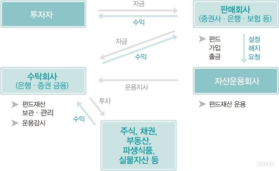 펀드 거래는 위와 같은 구조로 이루어집니다. 뭔가 상당히 복잡하지만 하나씩 알아보겠습니다.