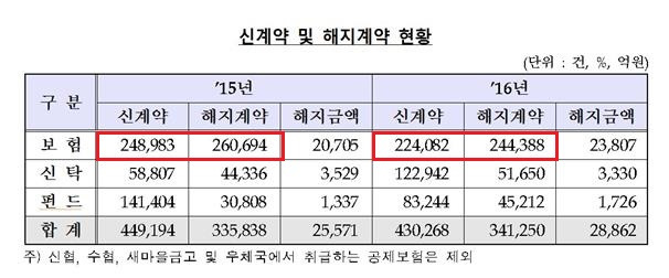 2015년, 2016년 모두 연금저축보험을 가입하는 사람보다 해지하는 사람들이 더 많습니다. 연금저축보험은 가입도 굉장히 많이 하지만, 안타깝게도 해지도 그만큼 많이 하는 것 같습니다.