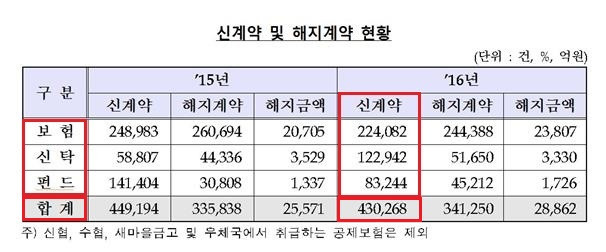 위의 금융감독원 자료를 보시면, 2016년 연금저축의 신 계약이 총 43만 건 가량인데, 계약의 반 이상이 보험이고, 나머지가 신탁, 펀드 순임을 알 수 있습니다. 2015년도 마찬가지로 보험이 반 이상이고 나머지 비중을 신탁과 펀드가 나눠 갖고 있네요.