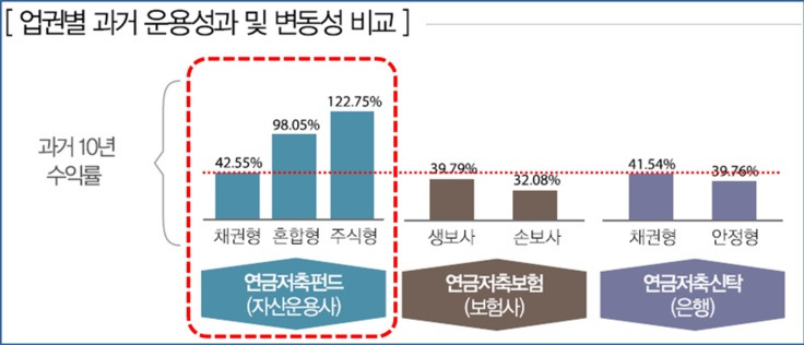 반면에 연금저축펀드를 보시면, 안전한 채권형으로 했을 경우 신탁, 보험과 비슷한 수익률이 나왔고 주식형, 혼합형으로 했을 경우 1년에 평균 10% 정도 수익률을 기록하였습니다.