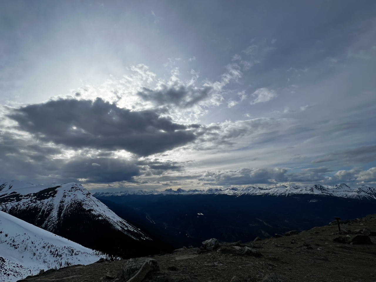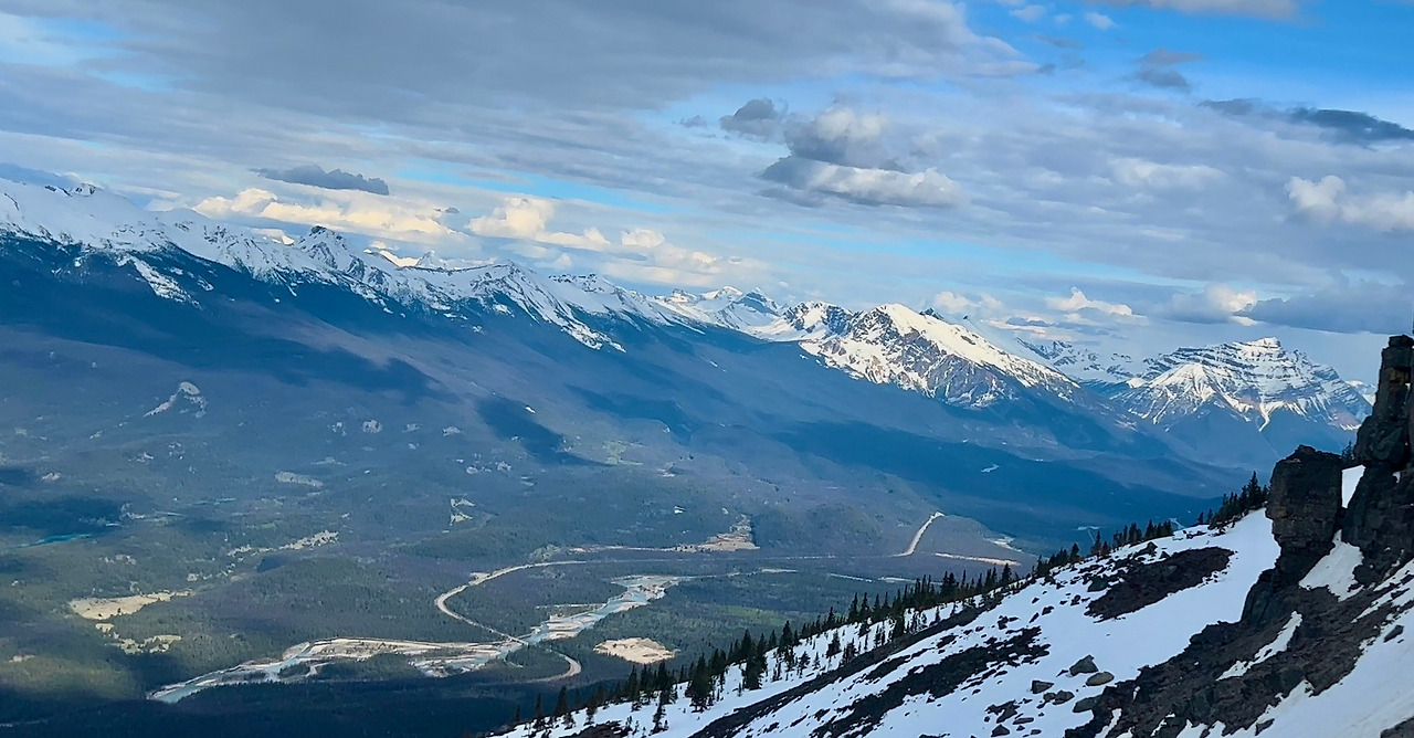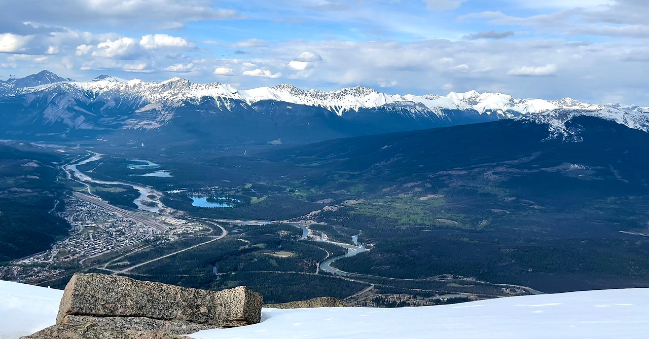 봉우리의 왼쪽으로는 작은 마을인 재스퍼의 시내가 보인다. 그 마을에는 높은 건물이 하나도 없다. 그리고, 시속 10킬로 정도로 천천히 움직이는 기차가 지나가면, 몇십 분간 건널목에서 한없이 기다려주는 주민들이 살아가고 있다. 그 마을은 숲에 안겨 있고, 그 모습이 봉우리 왼쪽 아래로 내려다 보인다. 한없이 여유롭지만 또 어딘가 쓸쓸한 풍경이기도 하다.