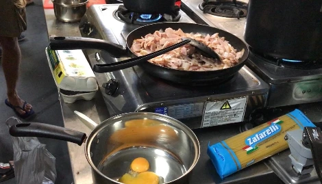 캠프는 숙식이 모두 제공되는 시설이었지만, 며칠 존부터 캠프에 먼저 묵고 있었던 B는, 캠프의 저녁이 너무 형편없다며, 본인이 저녁으로 까르보나라 파스타를 해주겠노라고 했다. B는 필요한 음식 목록을 메모장에 적어줬고, 나는 그것을 들고 C, D와 함께 캠프 밖으로 나와서 장을 봐왔다. 그 음식들을 가지고, B는 허름한 캠프 취사시설에서, 내가 어느 레스토랑에서 먹었던 것보다 맛있는 까르보나라 파스타를 만들어냈다.