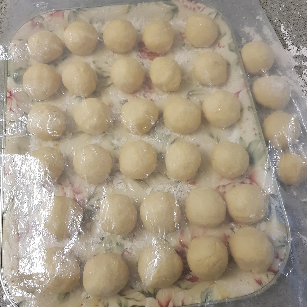 1차 발효된 반죽을 들러붙지 않게 밀가루를 뿌린 작업대 위에 올려놓고.. 45g씩 분할하여 동그랗게 둥글리기를 하고 난 후 마르지 않게 비닐로 덮어 20분 정도 중간발효(휴지)를 함.