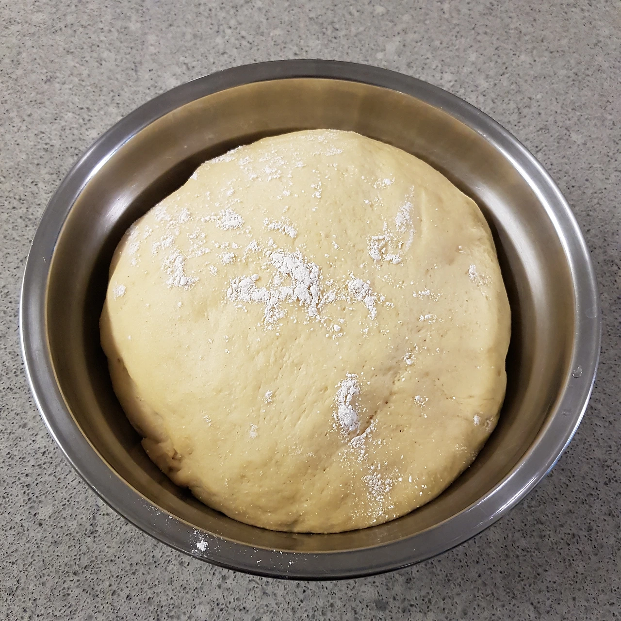 완성된 반죽을 스텐볼에 담아 들러붙지 않게 밀가루를 살짝 뿌리고.. 마르지 않게 비닐로 덮어서 한 시간 정도 1차 발효를 시킴.