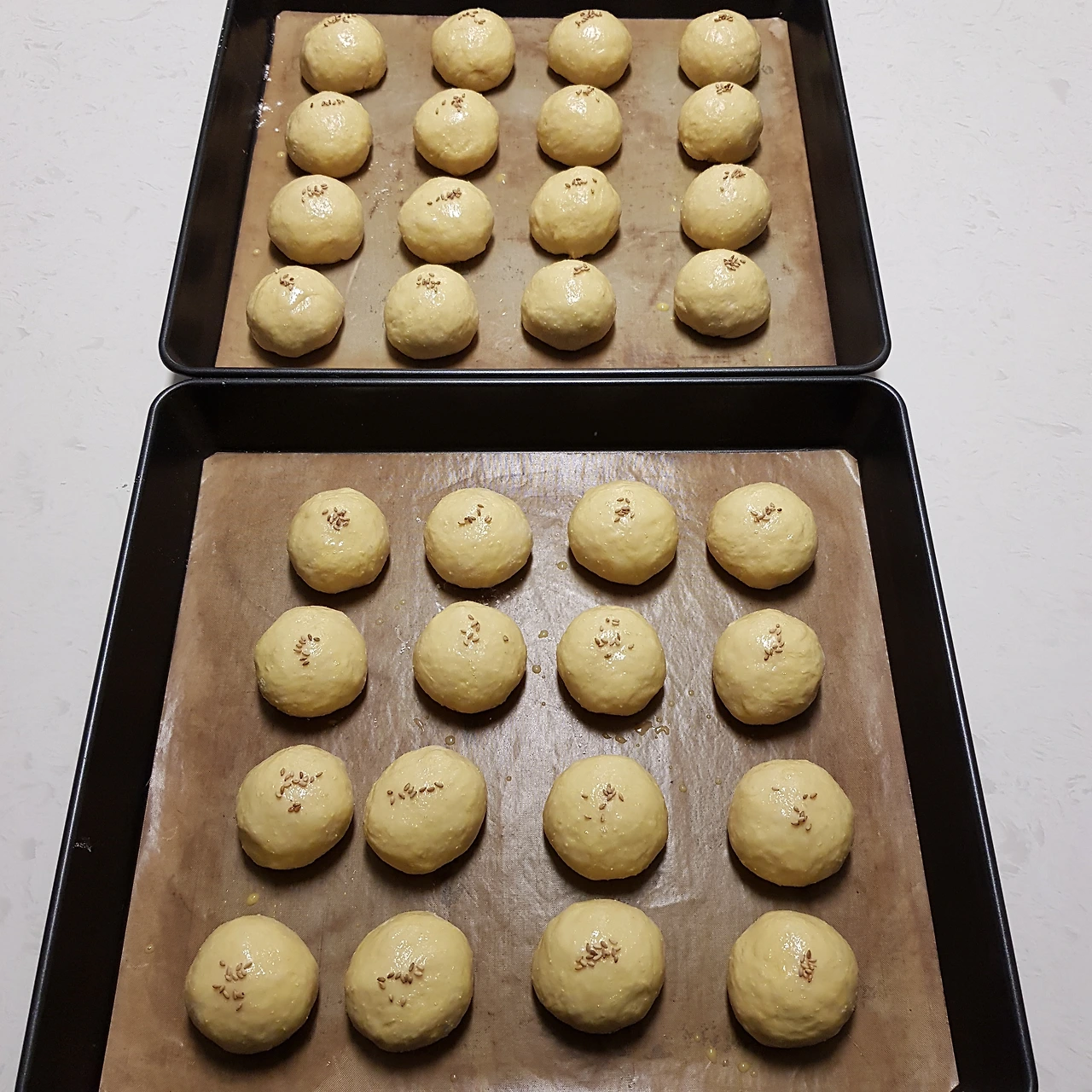 빵 모양이 원형이므로 따로 모양을 잡아줄 필요는 없고 다시 한번 가볍게 둥그리기를 한 후.. 오븐 팬에 적당한 간격을 두고 팬닝함.