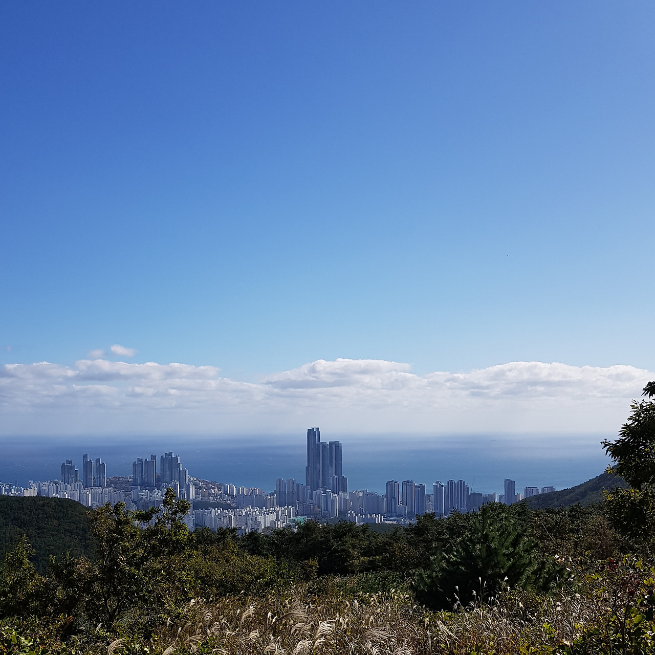 그리고 나타난 산 아래 풍경! 저 멀리 우뚝 솟은 해운대 LCT가 보이고, 푸른 바다 위로 하얀 구름이 동동 그리고 푸른 가을 하늘...